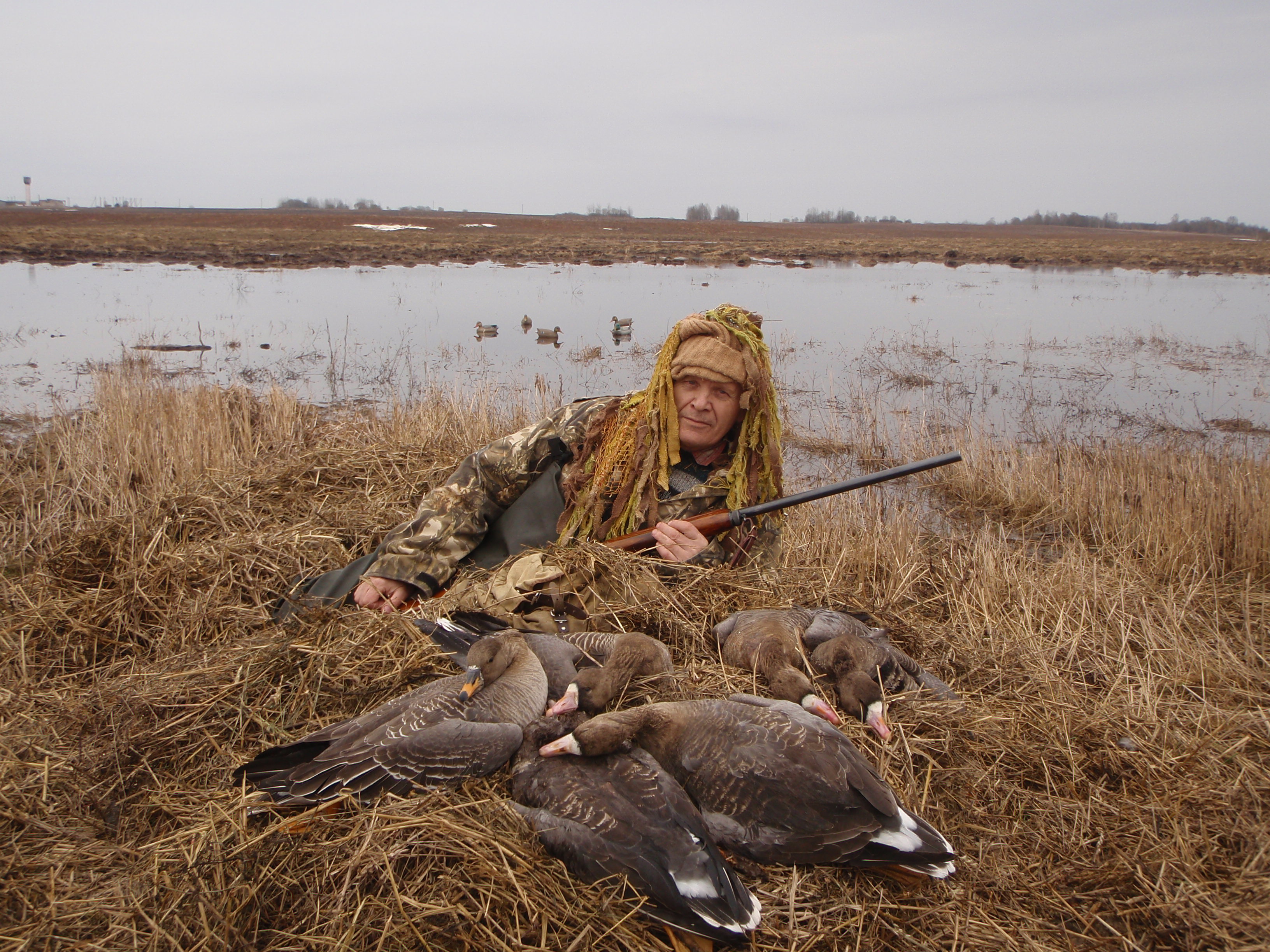 Учитывая сложность охоты на гуся и новые правила охоты, скрадок однозначно необходим. В свое время тоже испытывал огромное желание иметь что-то вроде самопального разборного скрадка. В конечном варианте пришел к единственному для себя варианту, который позволяет беспроблемно расположиться и замаскироваться на любой местности. Принцип скрадка всем известный газон. Но в основе у меня маленькая, одноместная надувная лодочка ЯЗЬ-01, весом в 4,5 кг На месте, я надуваю только переднюю секцию и получаю лежбище в виде кресла- кровати. Далее, для сохранения тепла ложу на днище лодки толстый коврик, накрываюсь самопальной маскировочной сеткой. закрепленной в ногах.На сетке креплю дополнительно газонную растительность под местность. Естественно имею пару сеток 2х3 под любую "клумбу", костюм "гилли". В итоге полная универсальность. Никаких мучений с окопом, грязью, водой, холодом. Все легко устанавливается, демонтируется и переносится. Лодка, в случае необходимости, поможет и в других вопросах.