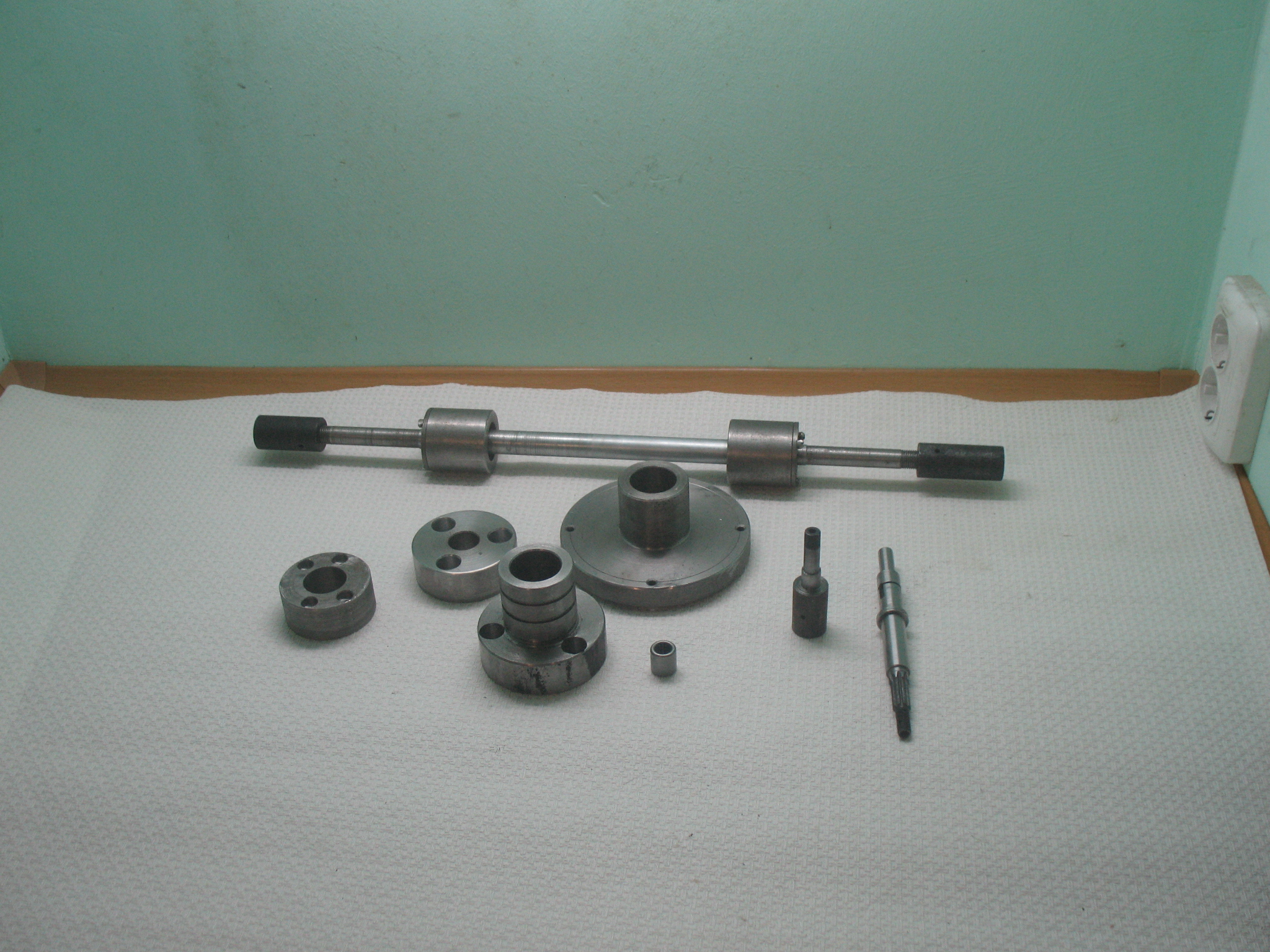Основной вал ноги. Подшипники установлены в муфтах. Переходные муфты на пилу и редуктор не присоединены, справа - та что к пиле, слева- к редуктору.