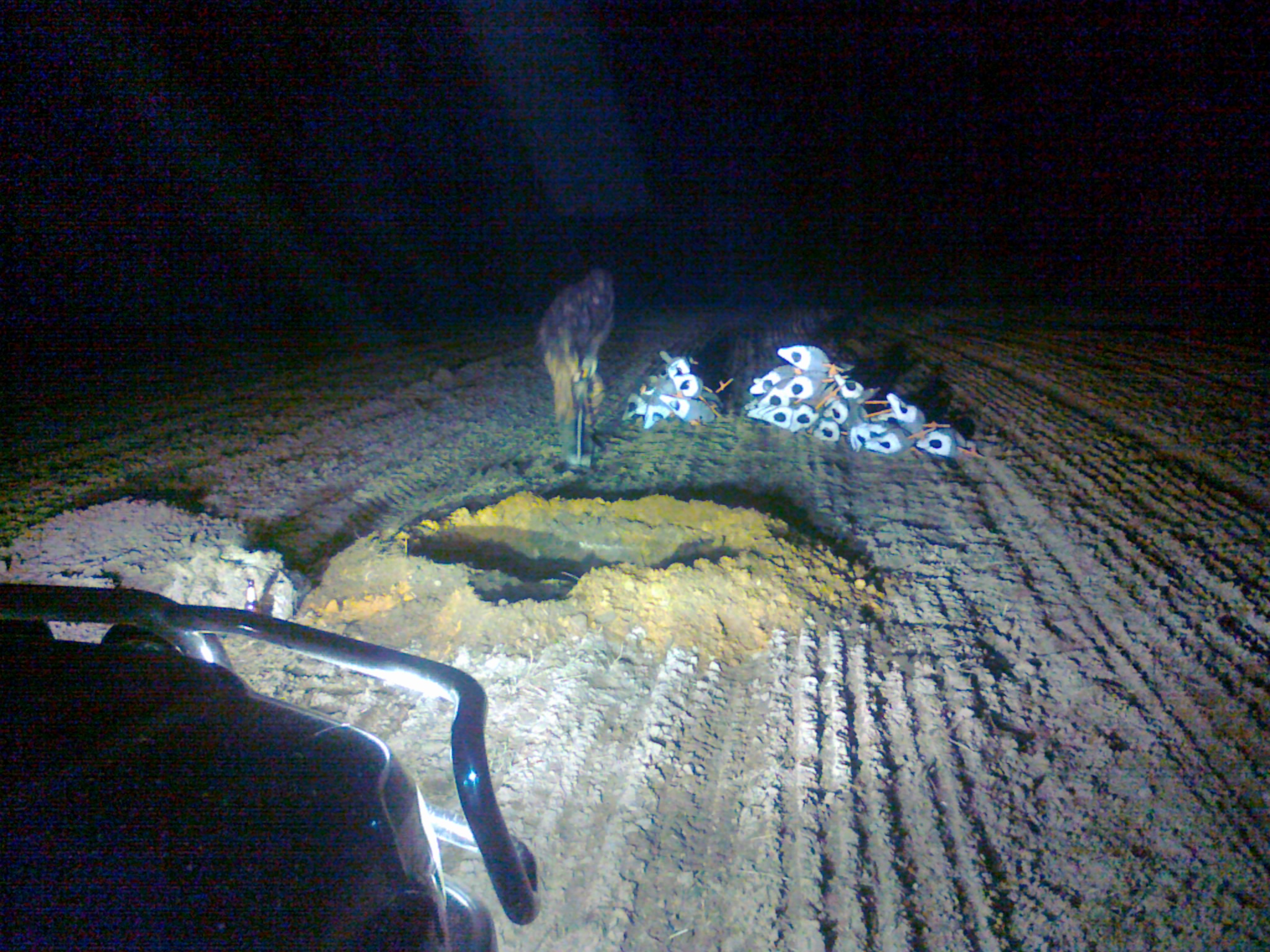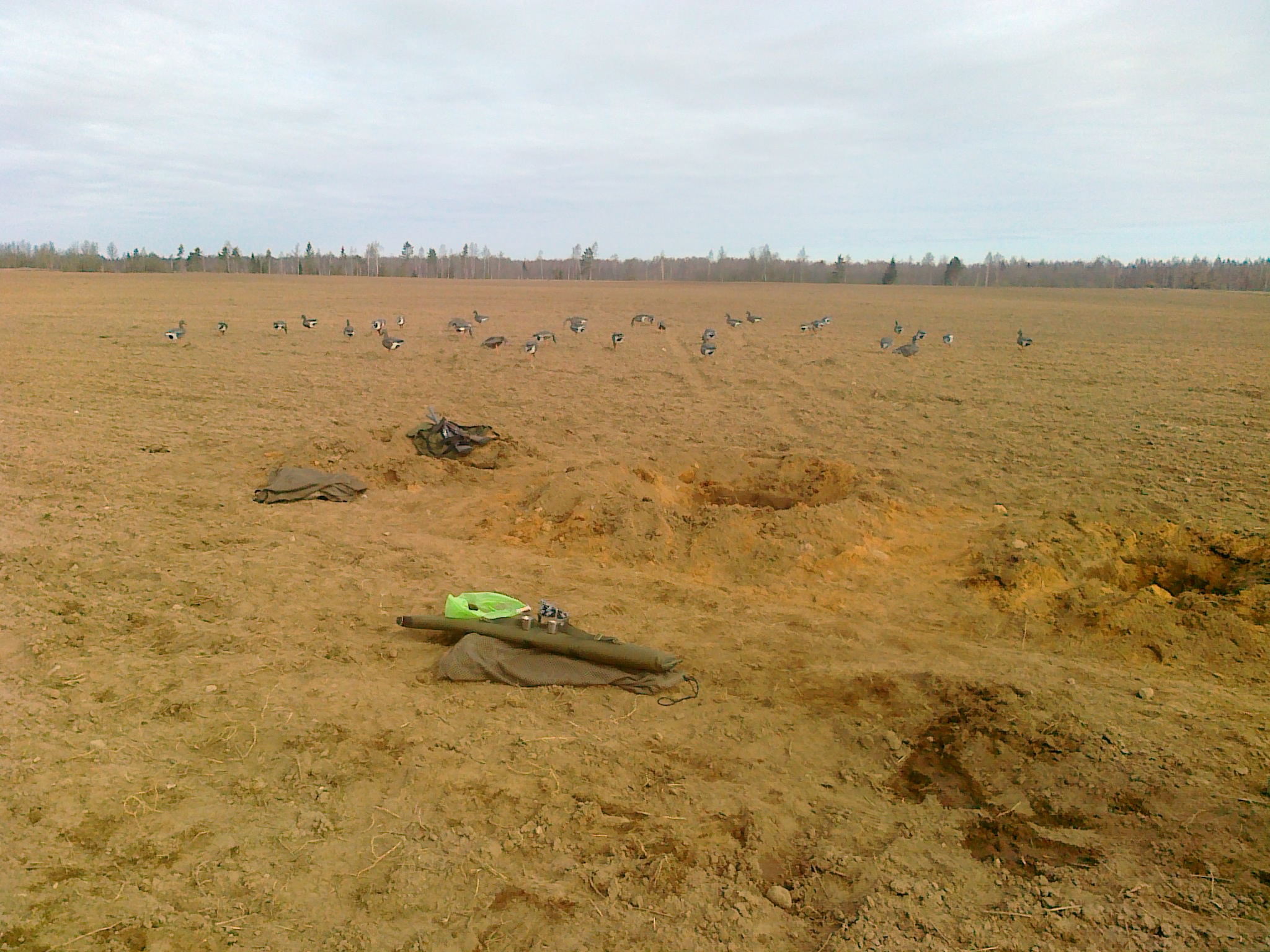 Дорога пролетела быстро, 300 км и мы уже на месте дома егеря в 1 час ночи. В его телефоне раздался тревожный наш звонок, зашли в дом, поговорили, оформились. я совместно с егерем посовещавшись, принял решение закапаться на том же прошлом поле только в другом месте на пригорке. Как оказалось, в эти выходные выросла конкуренция, сразу одновременно охотилось 5 команд: местные, 2 витебские, витебские-местные, и мы минчуки. Но Умница Палыч, при выписке путевок, рулил процессом и садил всех на разные поля, не давая почвы для обид. т.к. все поля были перспективными. УХХХ, попахивает соревнованием, я очень волновался за процесс охоты, т.к. был принимающей строной, и отвечал за результат. Ударить в грязь лицом не хотелось..... Поэтому все решения обдумывал очень тщательно до мелочей. Выехали на место, сориентировались, осмотрелись, пока ребята выгружались, я обошел периметр. Все - капаем тут, сказал я и Каменщик со мной согласился, определили места и разбились на сектора обзора. Пока один закапывался, мы с Геймером достали и распаковали 36 спортпластов. Тут уже Геймер пошел капать свой скрад, а я с Каменщиком начали расставлять профиля и ставить манок. Я закапался очень быстро, почва - песок, да и копать всетаки обучен. Основная работа была выплнена, и каждый начал обустваивать скрадки под себя, ямочки, ступени, материал, и т.д. Закончили все гдето около 3 ночи. Манок работал от телефона и я решил перекинуть мелодию на телефон Геймера, чтобы был резервный проигрыватель, оказалось, что Геймер в дороге не спал, а рубился с бибиками в телефоне в 1000 и усадил свою балалайку в ноль. За что был подвергнут критике. Уехали с поля и решли что надо перекусить. Поели ссобойку. Примерно в 4 были уже в скрадках и начали ЖДАТЬ. Ждать пришлось не долго. Погода - полный штиль, отсутствие облачности, и птички поют. Журавли как начали свою перекличку, так она не заканчивалась минут шесть, с разных сторон мы слышали их голоса, было очень красиво. Спать не хотелось, тянуло пострелять, и хотелось этого сильно.
