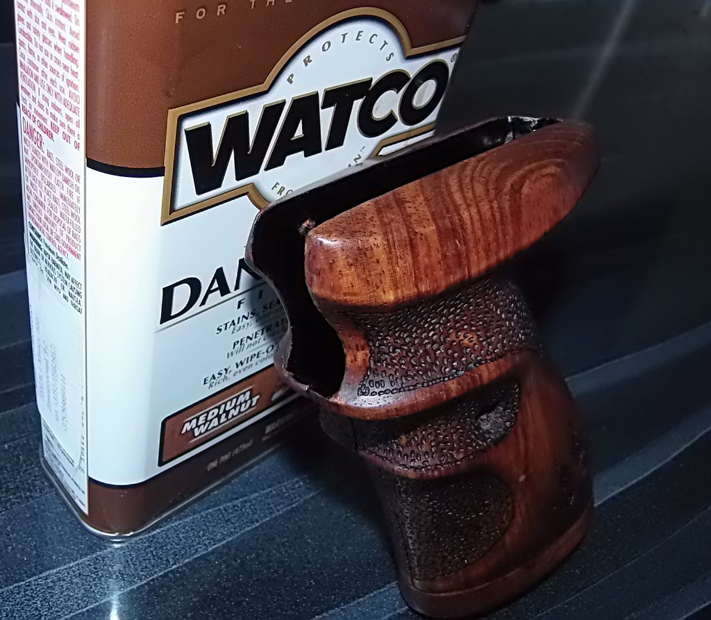 Ну а далее хочу поделиться впечатлениями с первым опытом по пропитке "буратинок" указанными составами.Сделаю это на примере законченной и готовящейся к отправке рукоятки пистолета Кросман 1377.До этого как знаете я красил свои изделия из фанеры краской аэрозольной