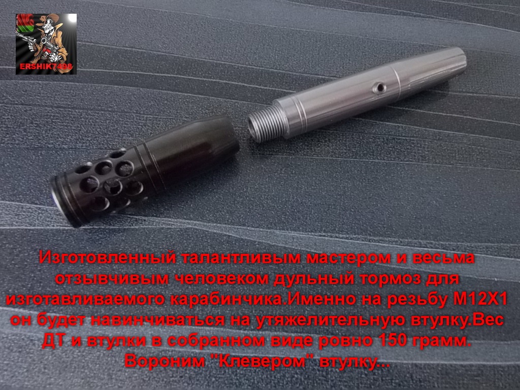 После предстояло доработать стволик.Известная болезнь 53-их Ёжиков-лёгкий ствол.Нужен был надульник на него.Решил сделать так:выточили мне втулочку стальную с посадкой на стволик-её и использовал как основной утяжелитель ствола,на конце её нарезали резьбу М12Х1.Крепится втулка на стволе с лёгким натягом и фиксируется гужончиком для исключения сползания:После всех подгонок втулка также была заворонена составом «Клевер».Вот собственно и она(он): Ну а для полной и чёткой завершённости на резьбу был водружён подобно знамени шикарный надульник ДЯДИ ГЕНЫ (MAIKE).Решил сделать пареньку подарок в виде этого потрясающего изделия Геннадия.Долго берёг его в своих целях,ну да ладно,пусть парнишка пользует на добрую память-думаю Гена не откажет в изготовлении ещё одного при необходимости,а карабинчик у паренька будет на зависть всем с таким надульником: Теперь пришло время коллиматорного прицела.Надёжно закрепил его на «ластохвост».С нужными колечками помог Лёня(Abonent)-за что ему и Димке(Krench) огромное спасибо.Коллиматор и кольца к нему-их заслуга!