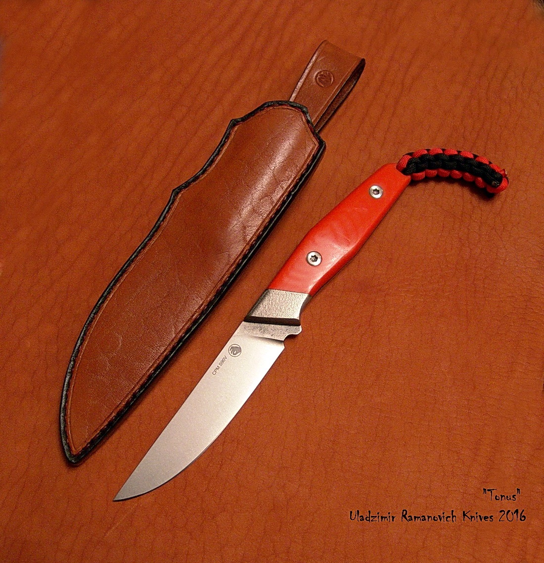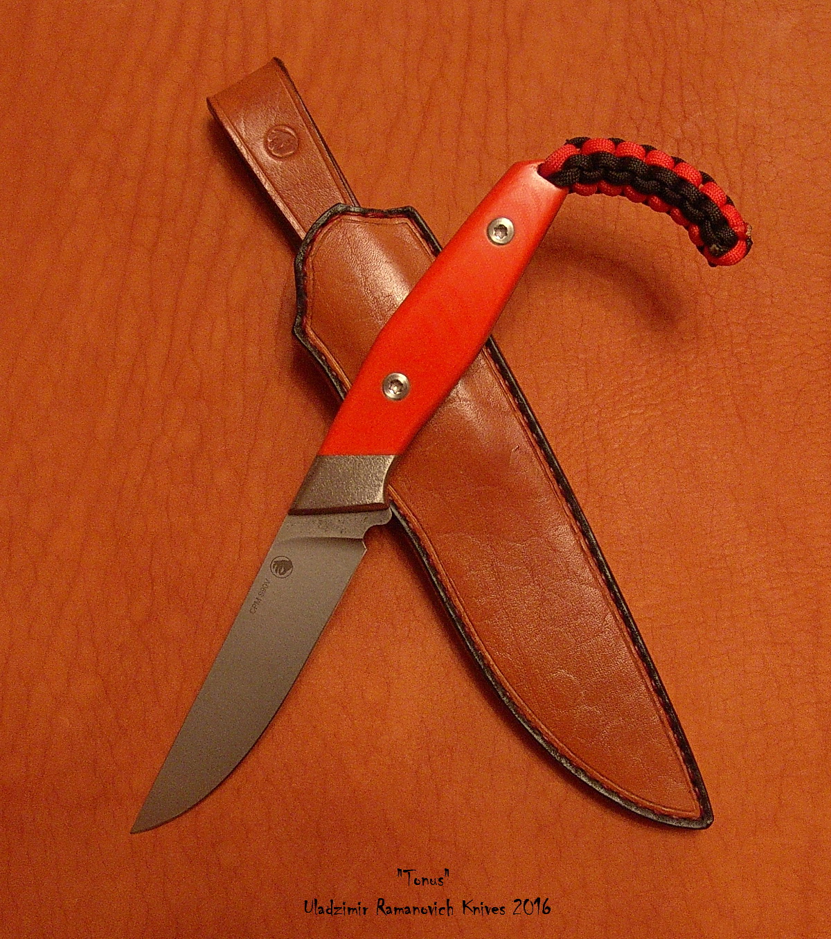 Нож "Тонус", клинок: сталь CPM S90V, твёрдость 60-61 HRC (крио), длина клинка 122мм, ширина 26мм, толщина 2,7мм, галтовка. Рукоять: длина 123мм, оранжевая G10, больстер: титан, винты: нерж. исправленные по геометрии. Ножны - кожа. Цена 425 руб., тел. +375-25-738-90-48, Владимир
