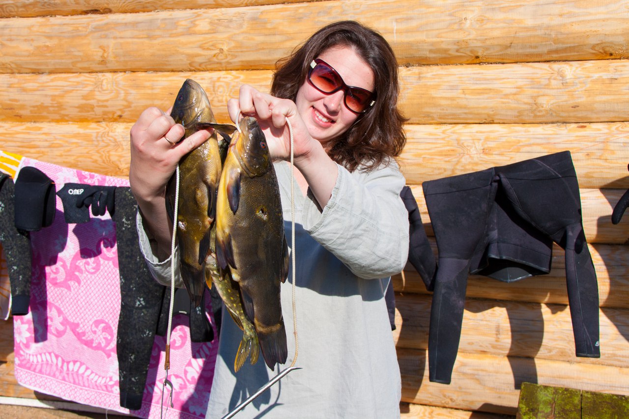 Я замираю, доли секунды решили всё, Амур мгновенно разворачивается передо мной и я бью его навылет в районе позвоночника. То, что позвоночник я ему не задел, я понял позже, когда он начал с бешеной скоростью разгоняться и разматывать катушку с линём. За что я люблю катушки: аккуратно взявшись за линь, начинаю немного сдавливать его в кулаке, тем самым притормаживая одуревшую рыбу как на фрикционе. Рыба остановилась, катушка почти пуста. В данном случае советую не тянуть на себя линь, а идти по нему до самой рыбы и брать её руками. Сделав именно так, я упёрся в плотный ковёр, под который зашился мой Амур - вот этого я не ожидал... Пришлось повозиться, что бы выковырять из-под него трофея и потом распутать этот клубок неожиданностей!)) Сидя на берегу и кушая "укусную собойку", примерно так мы с Санькой рассказывали друг другу сегодняшние подвиги. Доброй охоты вам, дорогие друзья! Помните, что подводная охота - это прежде всего спорт! Тренируйте свои навыки - и моменты побед в вашей жизни будут всё чаще и чаще.