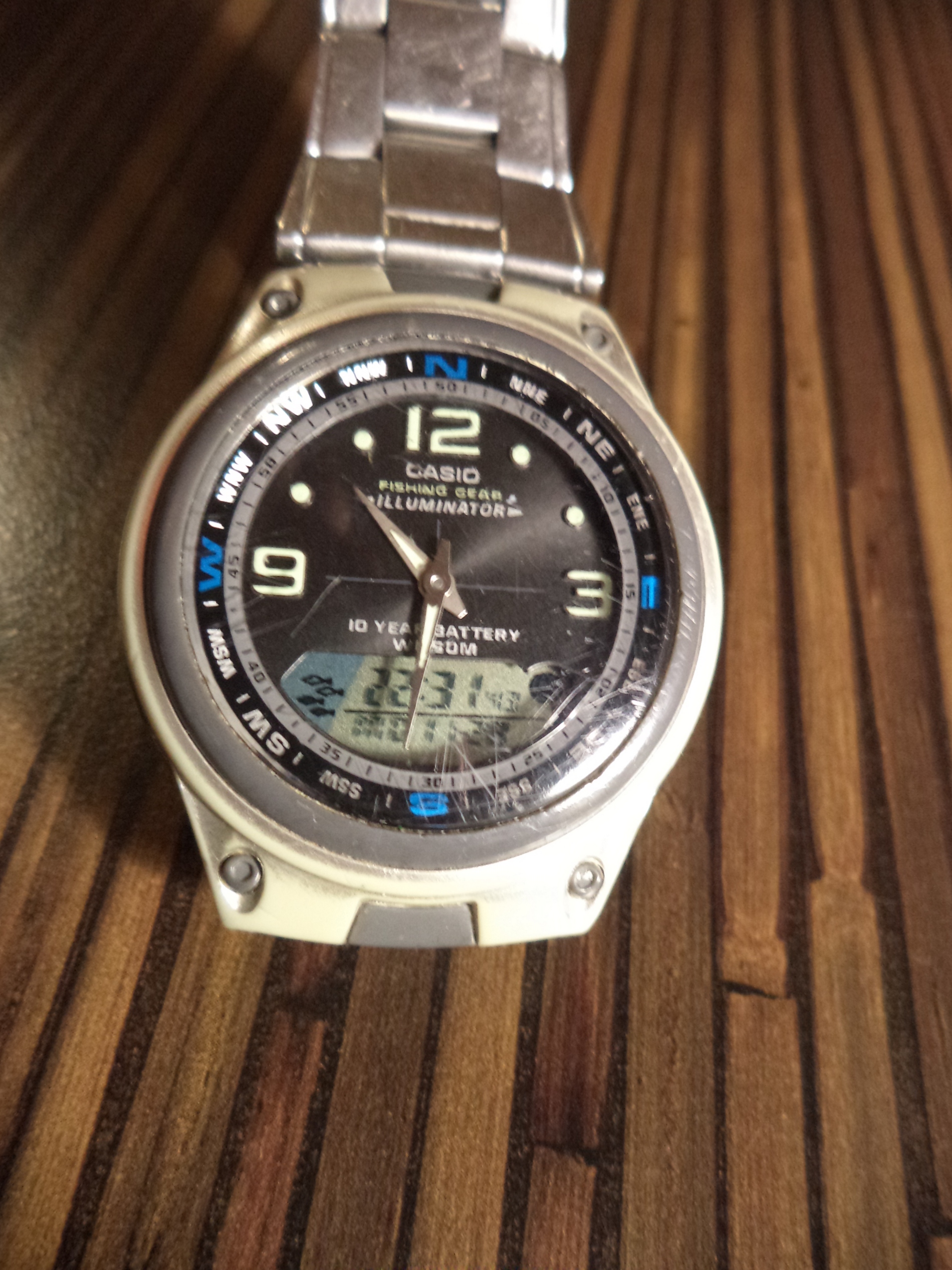 Вот фото "свежак". Часы CASIO с лунным и "рыбным" календарём. Купил лет 5 назад. Срок службы батарейки 10 лет. Именно эту модель выбрал случайно - продавец предложила, я и купился :-): . Перед этим были часы этой же марки, отслужили без проблем 10 лет, пока не потерял в лесу (браслет отстегнулся). Не реклама.
