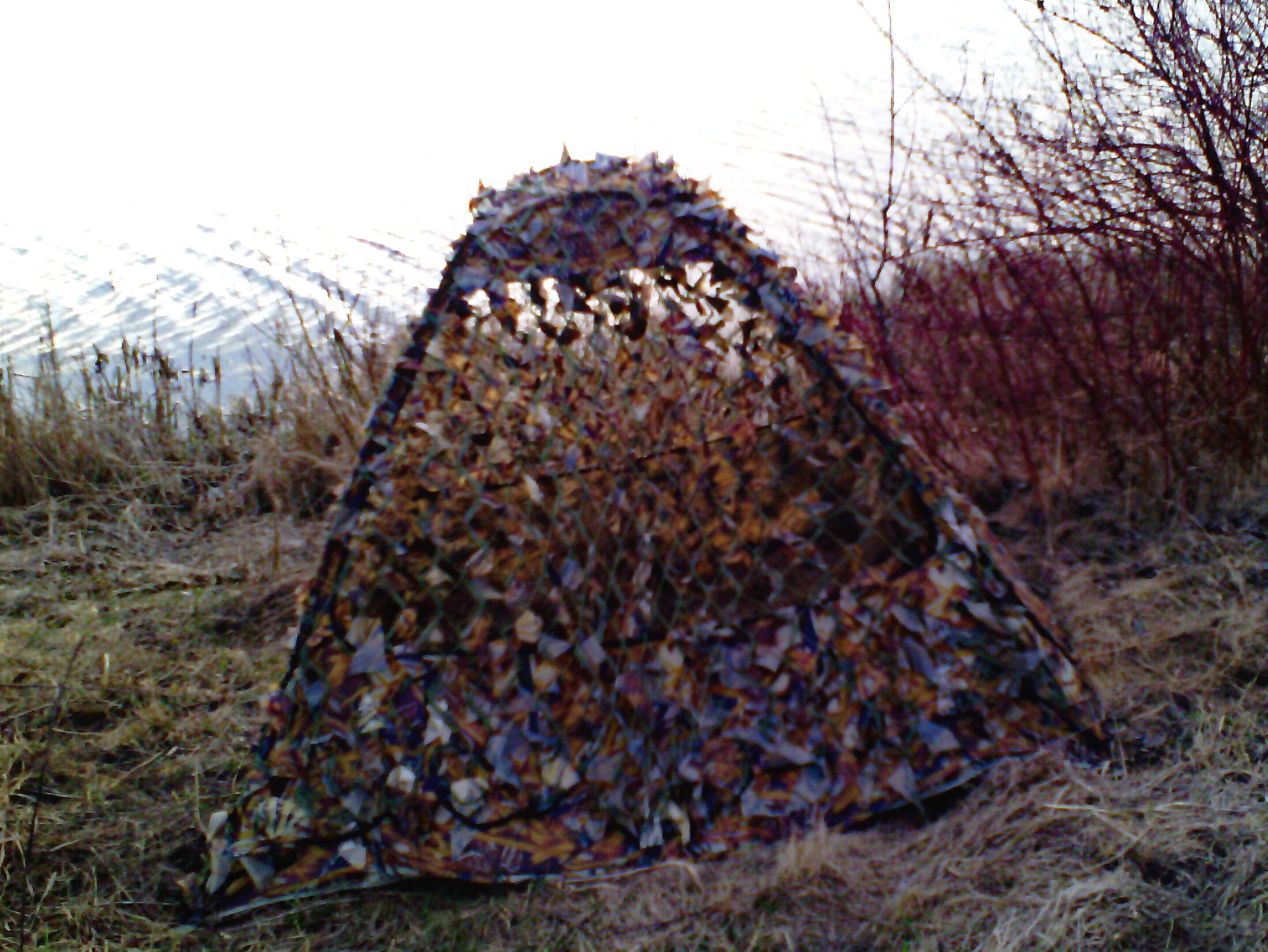 Объемное маскирующее укрытие для охотников при выжидании зверя и птицы с автоматическим принципом сборки с накидкой в комплекте. Расчитано на 1-2 человек. Главной отличительной особенностью является быстрота и легкость сборки/ разборки, позволяющей взрослому человеку установить засидку за считанные минуты без особых усилий. Засидка имеет форму усеченной пирамиды с крышей и представляет собой тканевую палатку, плотно натянутую, за счет жестко закрепленного каркаса, которая при сборке/ разборке легко скручивается в кольца. Со всех четырех сторон большие окна-бойницы, расположенные на расстоянии 0,45 м. от земли, которые одновременно выполняют роль входа. Крепление на месте к земле осуществляется через металлические полукольца для колышек (колышки в комплект не входят!!!). Накидка накрывает палатку сверху и крепится к ней по углам при помощи шнуров-завязок. Материал: палатки - Oxford PU кмф, каркаса - стальная сплющенная проволока , накидки - сетка из шнура, оплетенного «полосками- листочками» из синтетической ткани, упаковки - Cordura. Габаритные размеры в собранном виде: высота -1,35 м; в основании 1,85*1,85 м. Габариты в собранном виде: диаметр -0,63 м; толщина -0,05 м. Вес в чехле - 3,4 кг. Камуфляжная расцветка "камыш" (желтый/коричневый цвета).