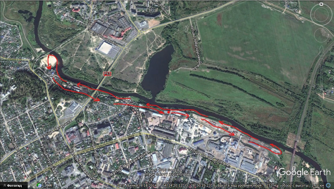 Во общем приехал я в Борисов 12 мая поздно вечером. Основной упор двухдневной поездки - уборка фазенды и "поднятие целины" перед посадкой огурцов. НО!!! Я не мог упустить момент поблеснить, находясь в доме, в двадцати метрах от реки. Посему прихватив с собой спиннинг и рюкзак со всеми блесенками и воблерами к которым просто горели глаза искупать их. Кто хоть немного знает Борисов, тот приблизительно прикинет как я построил свой предстоящий утренний маршрут, а пролегал он от транспортного моста до железнодорожного и обратно от ж.д. до пешеходного моста. Как это я сразу не сообразил выкинуть Вам скрин шот из гугл карты... :-)
