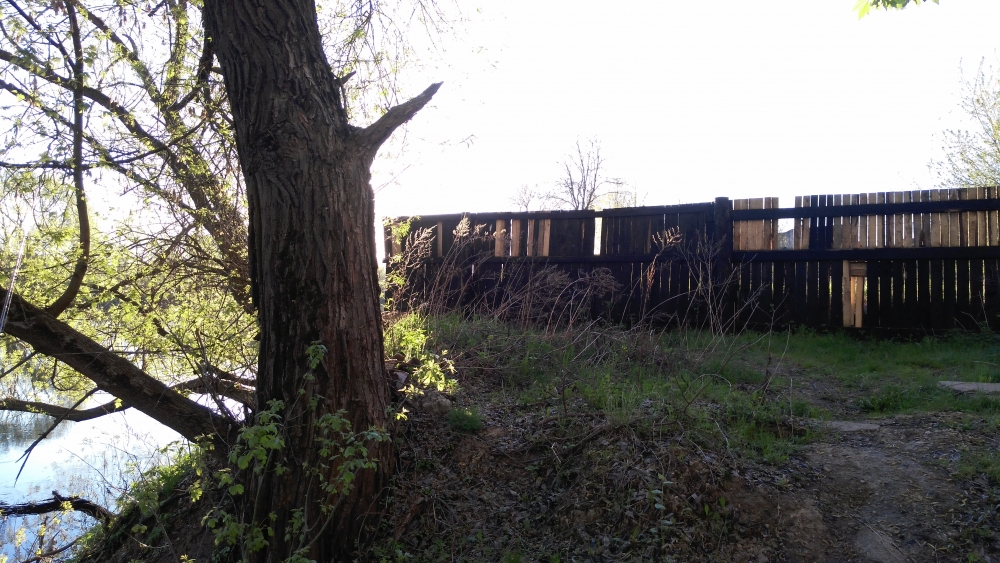 Утро было прекрасным: чистое небо, предрасположенность к теплому дню (напомню, что 10 мая выпал снег) и полный штиль... Несмотря на все это было прохладно и я далеко не прогадал в том, что одел Горку с флисом и взял вязанную шапочку. В самом начале, еще не начав свой маршрут, я уже получил дозу огорчения... Местная школа по байдарочному спорту, расположенная прямо на берегу реки и напротив моего дома, каким-то чудным образом получила разрешение на расширение территории, ввиду чего ими были выставлены столбы, полностью перегораживающие ЕДИНСТВЕННЫЙ спуск и подъезд к воде на несколько километров!!! И это несмотря на то, что на военных картах это место обозначено как возможный брод и место установки понтонов, а также местные РОЧСы приезжали за забором воды... Забегая немного вперед скажу, начало выясняться, что это вроде как уже и не к школе относится, а к некоему ИПэшнику по сдаче внаем водных скутеров, лодок и т.д. Большое ему за это спасибо, с коляской теперь к реке без преувеличений не спуститься, будет куча машин и носящиеся водные мотоциклисты в месте где купается весь город... С реки это выглядит все так!!!