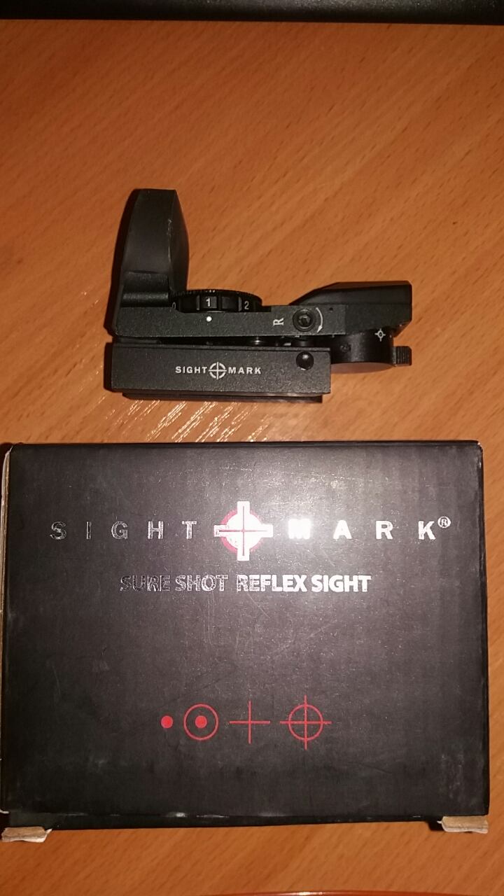 Калиматорный прицел Sight Mark состояние нового примеривался 1 раз , не пошел по крепежу в нем ласта . 4 вида прицельной марки , цвет красный ,защитный чехол на линзу .