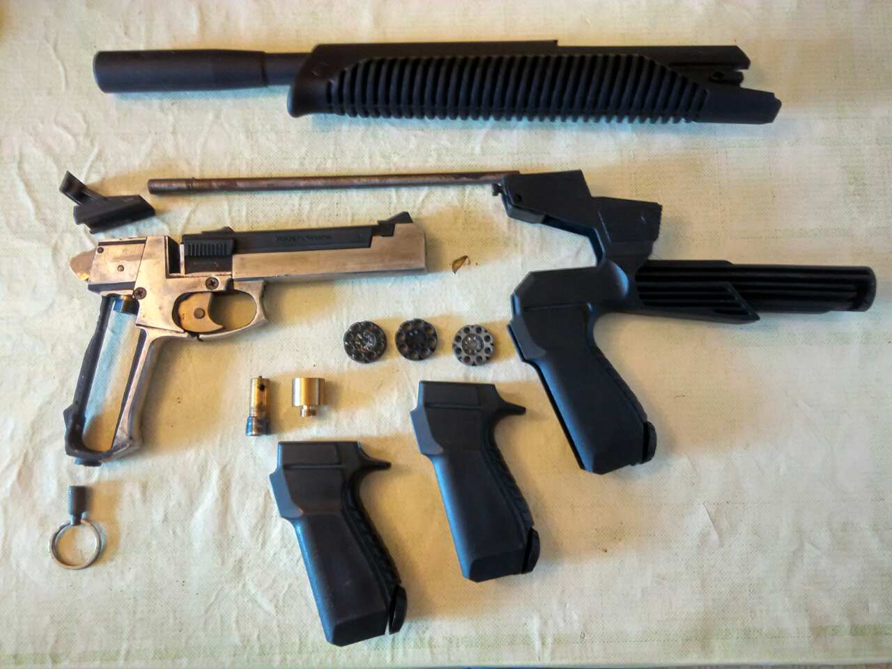 Продам сие изделие.В комплекте:родная и удлинённая(235мм) дудки;два клапана с обтюраторами(8 и12г),увеличены отверстия перепуска;накопительная камера;клип-металл,клип-пластик,клип-заготовка(стеклопластик);не полный обвес(без приклада),2 рукояти,целик-металл.