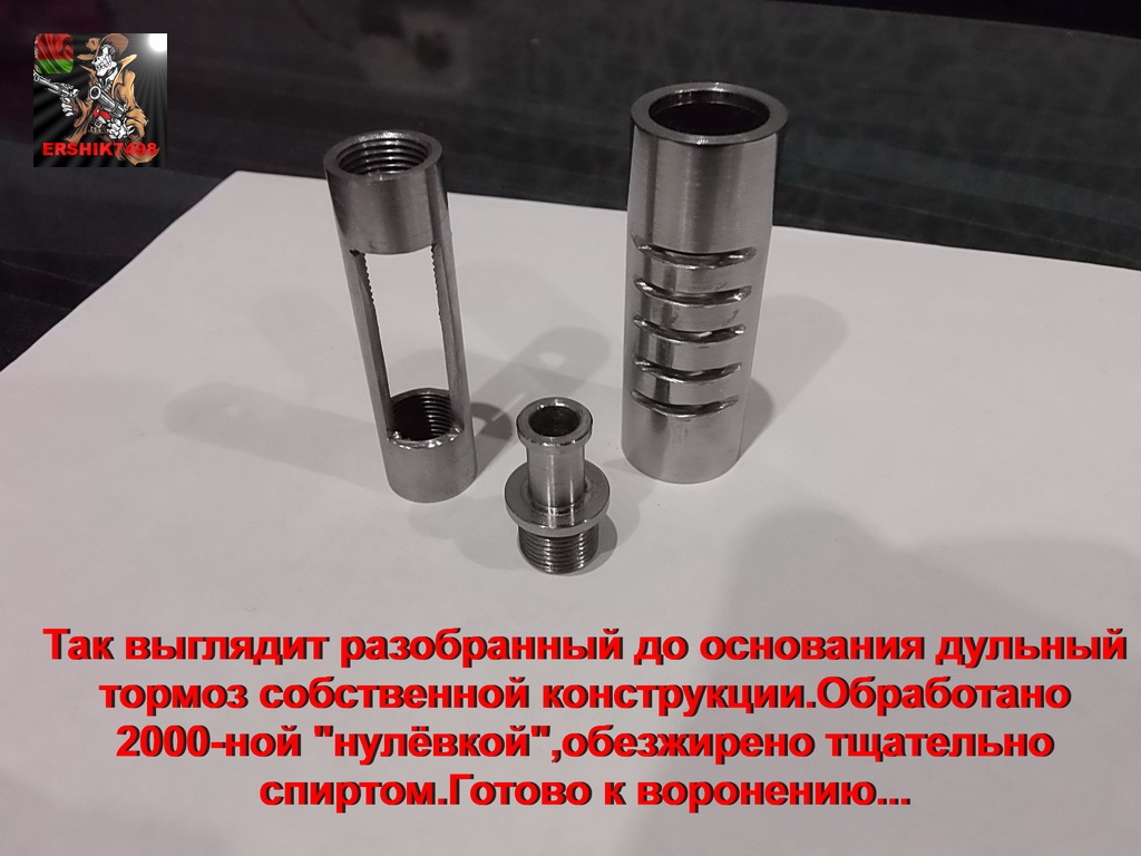 Первым был выточен «дульный тормоз».Придумал свою конструкцию,состоящую из трёх деталей.Основного корпуса тормоза с так называемыми «жабрами»(делал именно эту версию ДТ-старенькую), внутренняя вставка с пропиленными «окнами»(чтобы «жабры» светились),в ней нарезана с обоих сторон резьба М12Х1.Третья деталь-передняя пробка с «носиком».На ней тоже резьба М12Х1.Именно на неё она фиксируется во внутренней вставке,резьба со второй стороны вставки-для навинчивания собранного ДТ на ствол «Мурки».Оставалось только заворонить эти детали и собрать ДТ-просто запрессовав внутреннюю вставку в основной корпус,и вкрутив переднюю пробочку.Примерно вот так:воронить эти детали и собрать ДТ-просто запрессовав внутреннюю вставку в основной корпус,и вкрутив переднюю пробочку.Примерно вот: