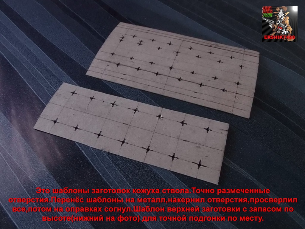 Пришло время для двухсекционного кожуха ствола.Самым доступным для его изготовления было оцинкованное железо.Гнётся неплохо,но только по оправкам и в тисках.Для начала сделал шаблоны двух заготовок из картона,разметил все отверстия в них охлаждения ствола.Всё было с допуском для возможности по месту отрезать лишнее.Вот: