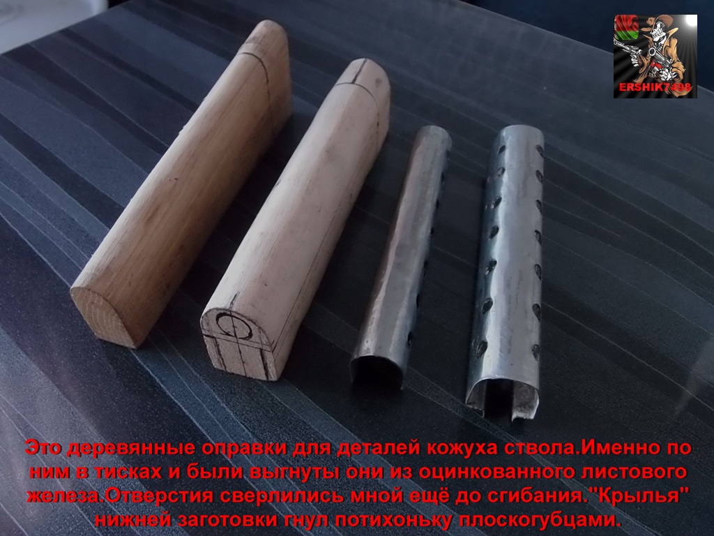 Как видите и передняя деталь кожуха ствола(газоотвод) вышла.О нём позже…Ну а «пень» был собран с намушником на ту же «хол.сварку».Теперь это стало одной деталью-надёжно и просто.Отдать время на обработку надфилями,наждачками-и готово: