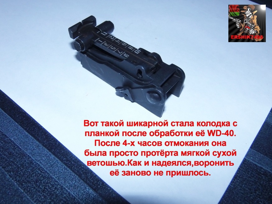 Далее требовалось обдумать прицельную планку с колодкой.Хотелось найти оригинальную,мосинскую,но удалось отыскать колодку с целиком АК-очередной «подгон» товарища.Отпилил болгаркой до нужной мне высоты.Состояние её внешнее было не очень…Лёгкий слой ржавчины,пыль..Не хотелось её разбирать и чистить наждачкой для последующего воронения.Попробовал просто отмочить её в WD-40.Обильно обрызгал её этим «дихлофосом»,оставил на отмокание.Через часа четыре попробовал протереть её мягкой тканью и УРА!!! Колодочка и планка просто засияли,сохранилось родное воронение,цифры на шкале даже оригинально белыми стали. Вот что было и стало: