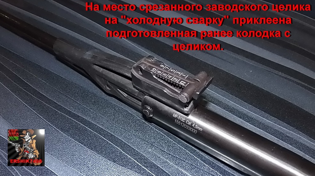 Теперь необходимо было «водрузить» эту деталь на казённик «Мурки».Родной целик со всеми потрошками был спилен ножовкой с муфты,на его место на клей «хол.сварка» была закреплена колодка с целиком от АК.Делалось всё аккуратно,точно по уровню.Перекосы нужно было исключить для возможности стрелять с открытых прицельных-удалось это: