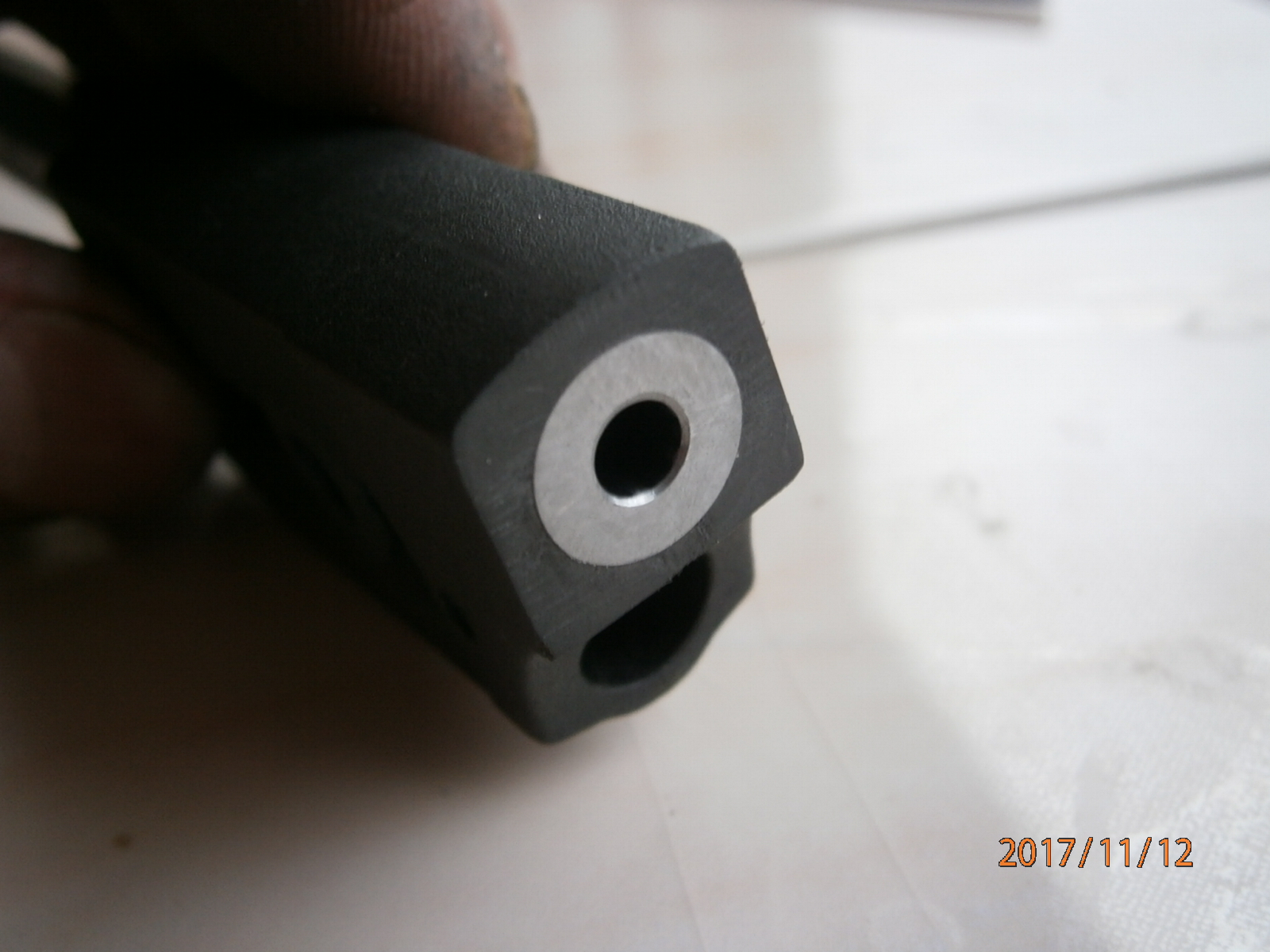 . формат А4 не всегда ловил маслины. перепробовал весь доступный в нашем магазе свинец, но всё безрезультатно. стало ясно, что косяк кроется в стволе после детального осмотра оного. на фото видно светлая полоса псевдочека под проточкой на стволе.кастрации подлежат 16 мм ствола