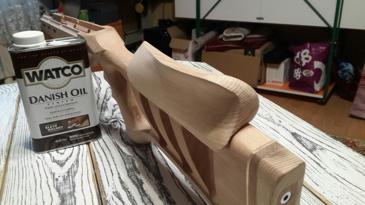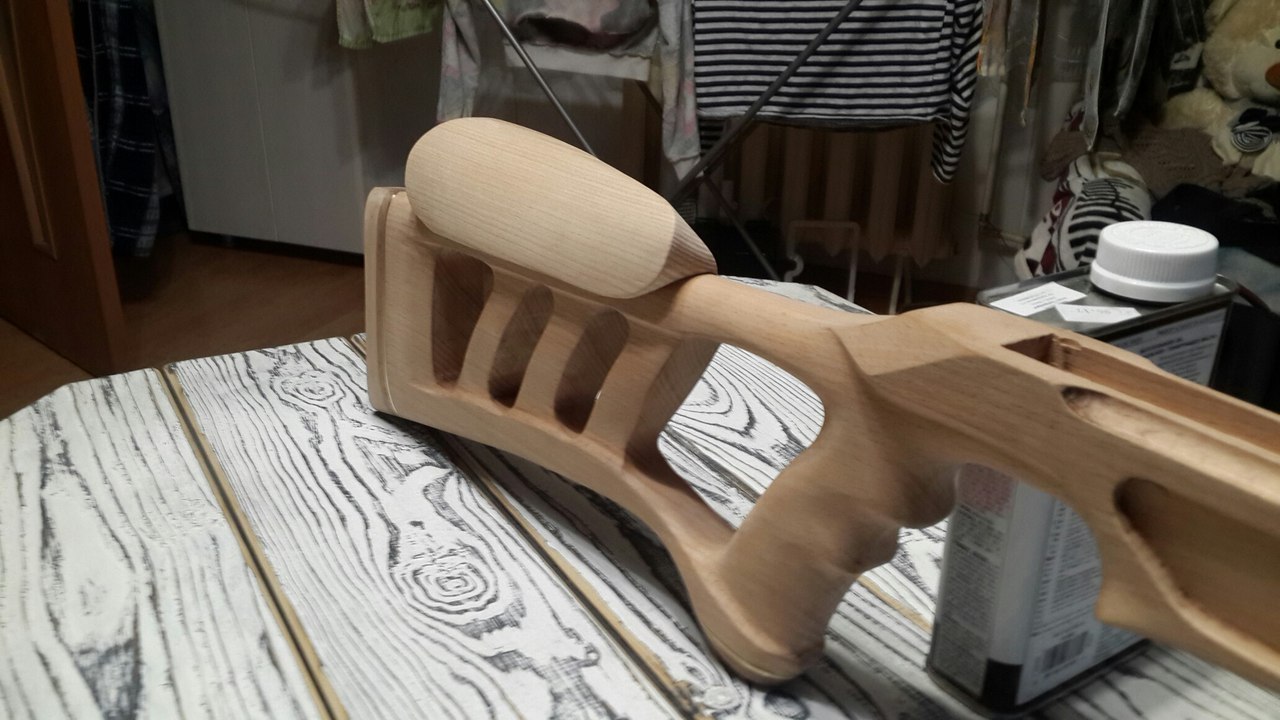 решил попробывать сделать ложе на свою мурку . за основу взял форму у одного мастера из всего что видел этот дизайн очень понравился. была у меня как раз заготовка бука из нее решил и делать хотя есть и ясень . добавил своих штрихов дизайнерских и понеслась. на данном этапе все фрезеровки закончены и грубая шлифока осталось регулируемую щеку сделать.