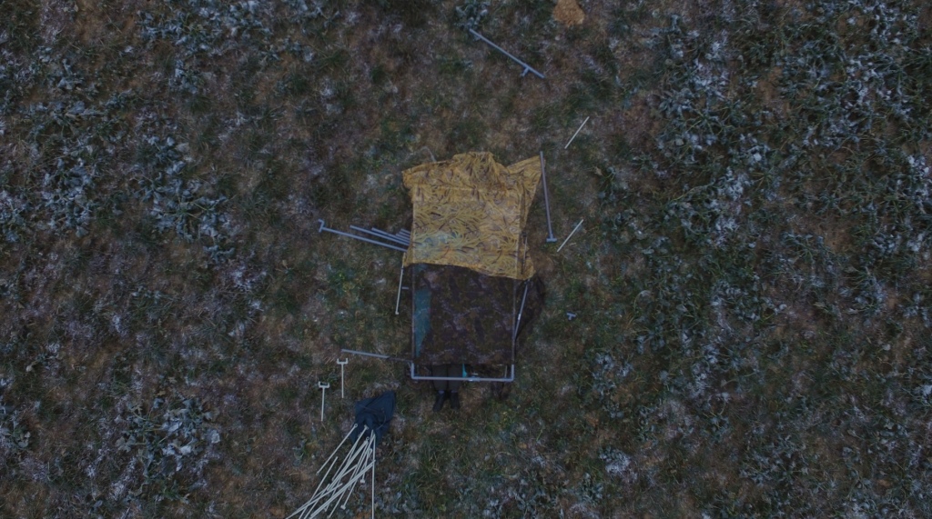 Высота около 100, 30 и 5 метров. На скрадке 2 вида сетки, желтая и для эксперимента взята расцветки "Дуб". Поле - озимый рапс. Фото января 2018. Больше фоток не сделали по причине мороза, техпроблем и малого опыта. Под сеткой лежит оранжевой стороной туристический коврик и загонная жилетка.