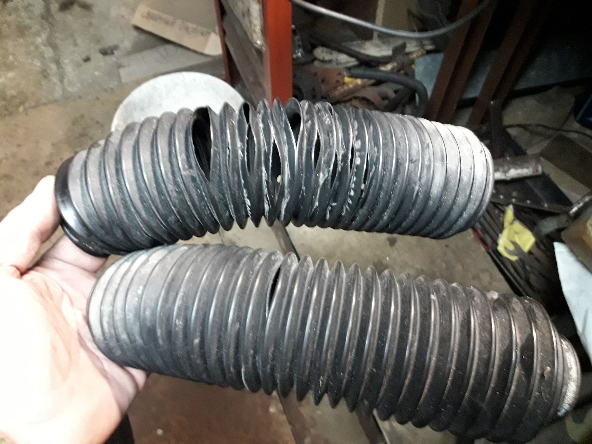 Пришедши додому, посёрбывая водку, занялсо инкрустацией, нарезая попадающиеся под руку резинки кольцами. Оставив две "волны", запихал полученное из старых резин мумиё в новокупленныя гофры. Приклеивать герметиками не стал, и так не вылезет. На низ , на всякий случай, шоб внизу если шо не торчали оголённыя перья, отрезал то что ешшо осталось от оригинальных гофр. После установки колеса и покачивания вилкой определиццо надо это или нет. Заточивши трубочку, заодно напробивал в новых гофрах немного дырок для воздухообменов.