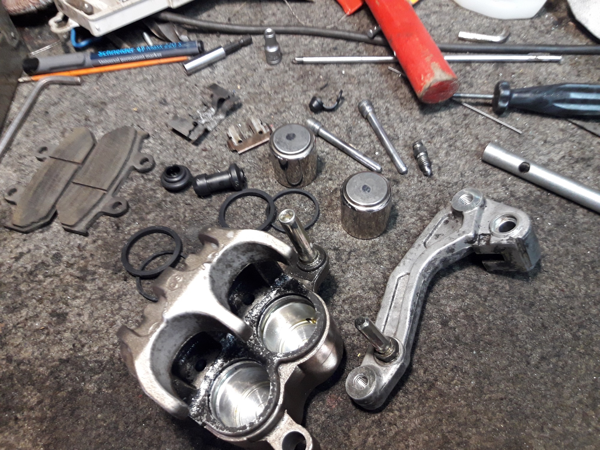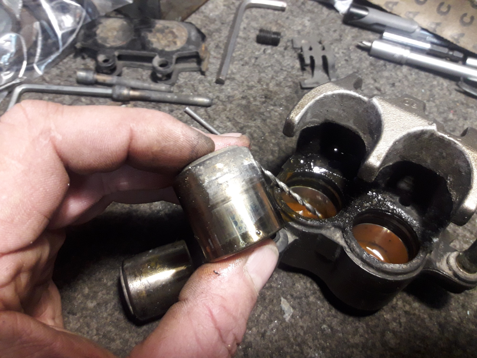 По заднему диску шоркала колодка, а вот с передними тормозами проблем никаких не было, однако влез и тудыть.. И вовремя. В суппорте нашел вот такой "солидол". Это к вопросу о сроке годности и прочих свойствах тормозухи которую походу никто не менял со дня самого производства мотоцикла. :st_ruskiy: