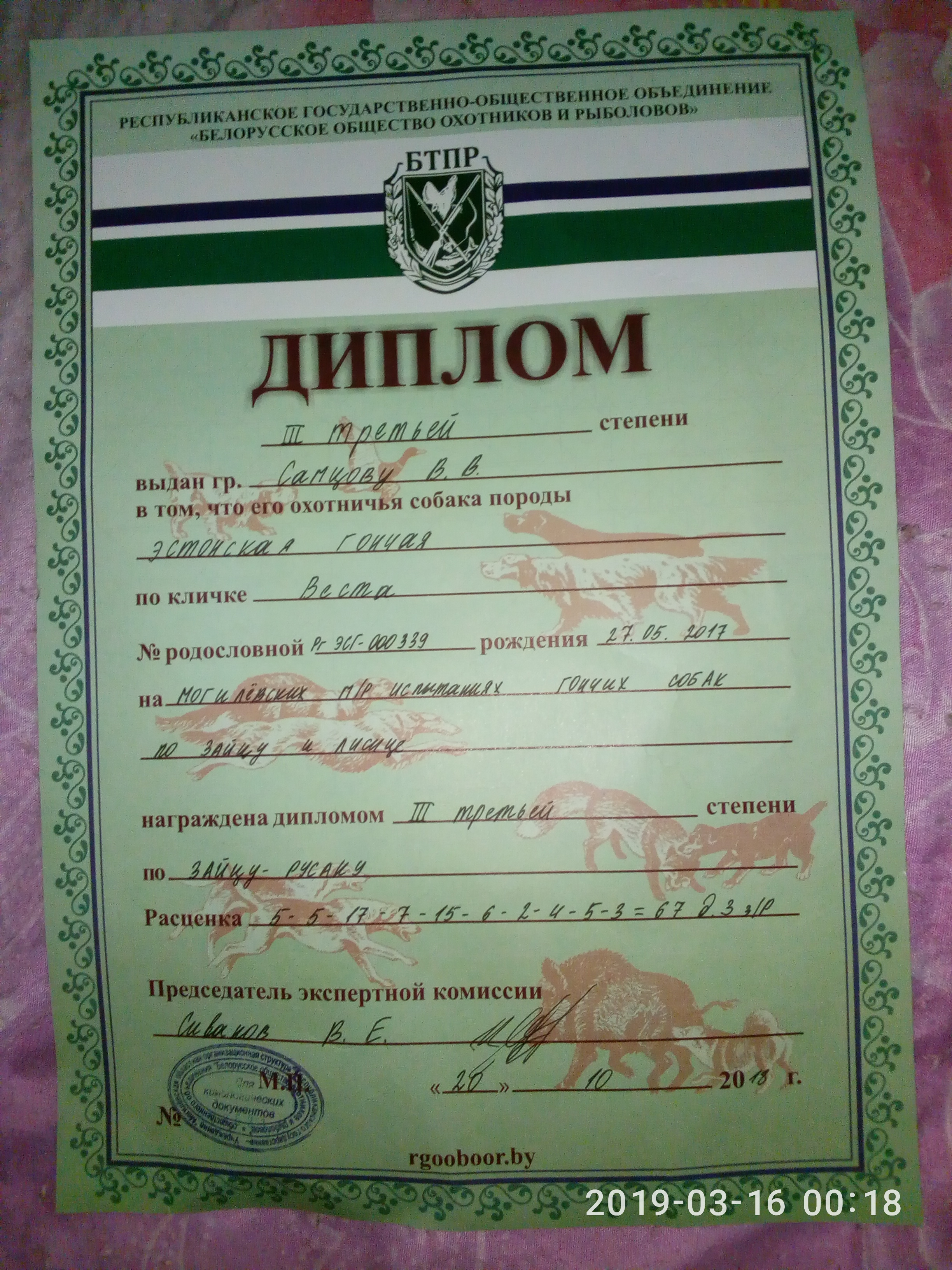 2. 22.04.2018 Первое место на Новогрудских районных состязаниях, Диплом III степени заяц беляк 6-5-20-9-15-5-1-4-8-4=77