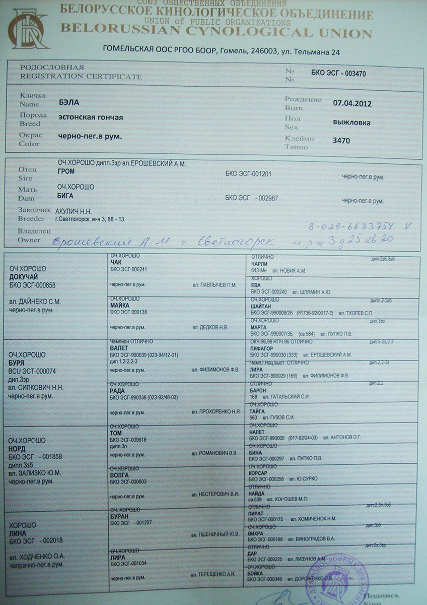 БКО ЭСГ-003470 ; 07/04/2012; Бэла, вл.Ерошевский Александр Михайлович (эксперт I категории по гончим)