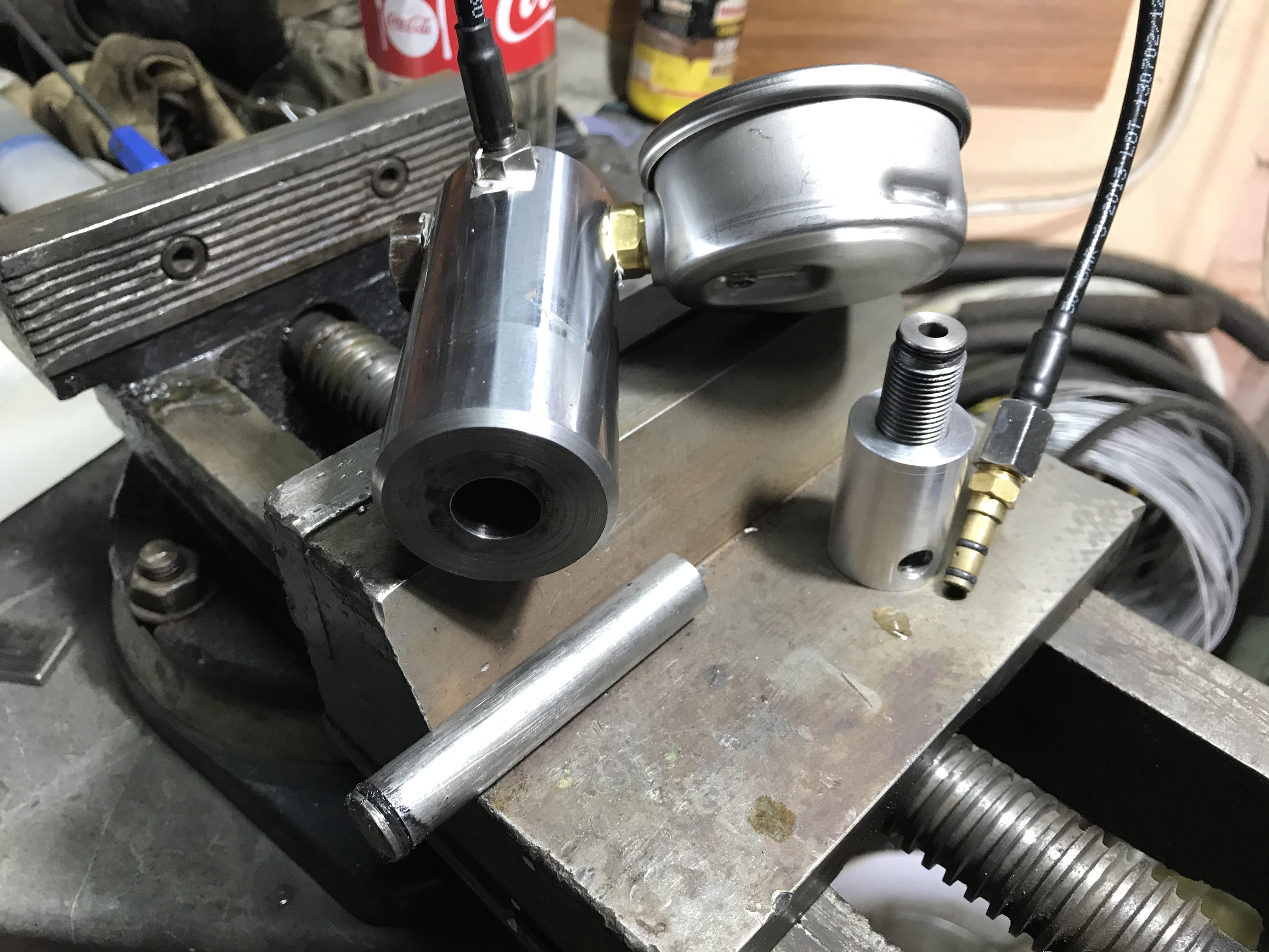 Просто, болванка с отверстием ф14 и штырь с резинкой. Мне так показалось проще, чем с домкратом мудрить. При 450 Резник раздулся на 4 сотки, после снятия давления вернулся к своему размеру. Ф35мм стенка 3,7мм д16т