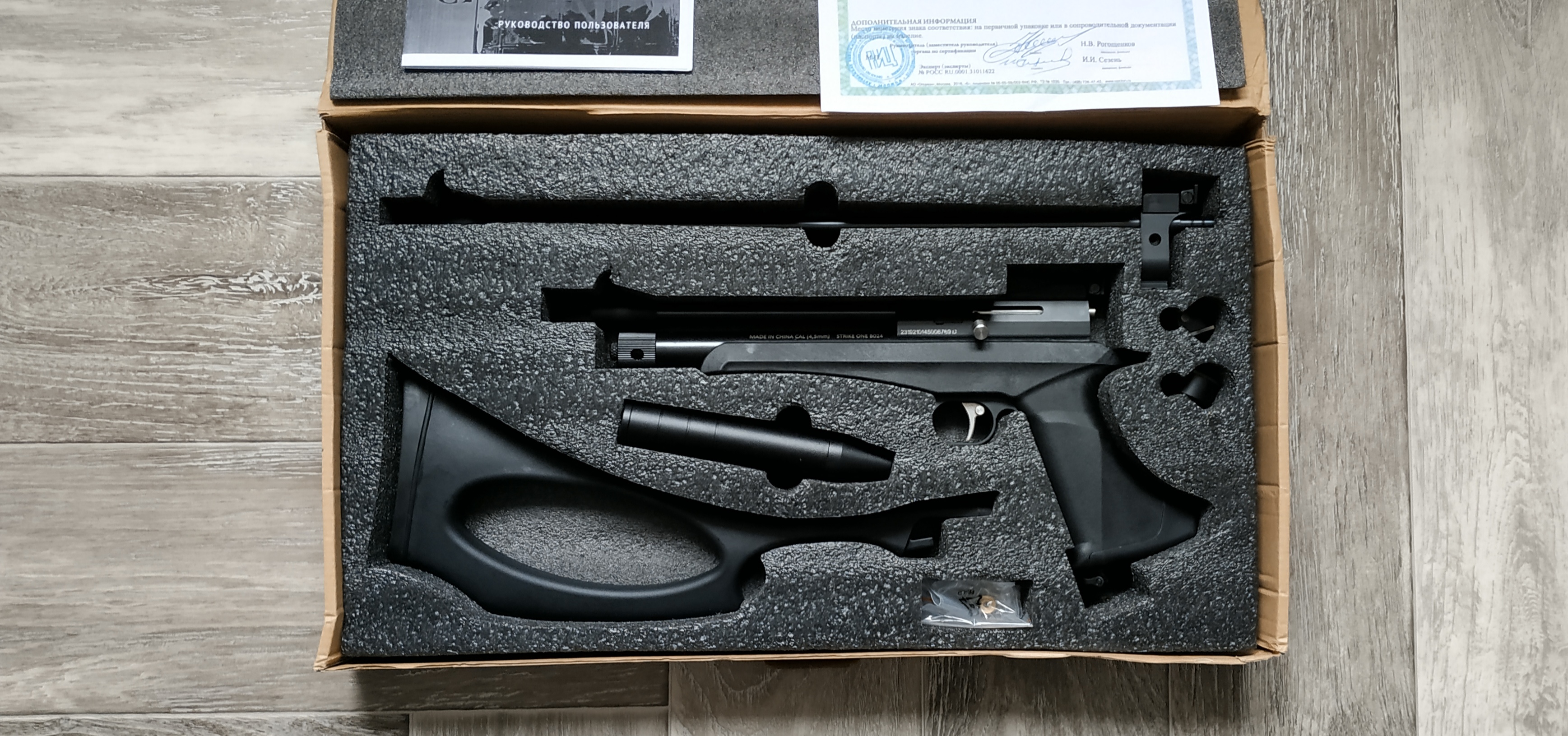 В комплекте все что на фото, включая сам винт, приклад, модератор, второй стволик с восьмеркой, два магазина, лоток для одиночной стрельбы, Комплект РТИ и документы