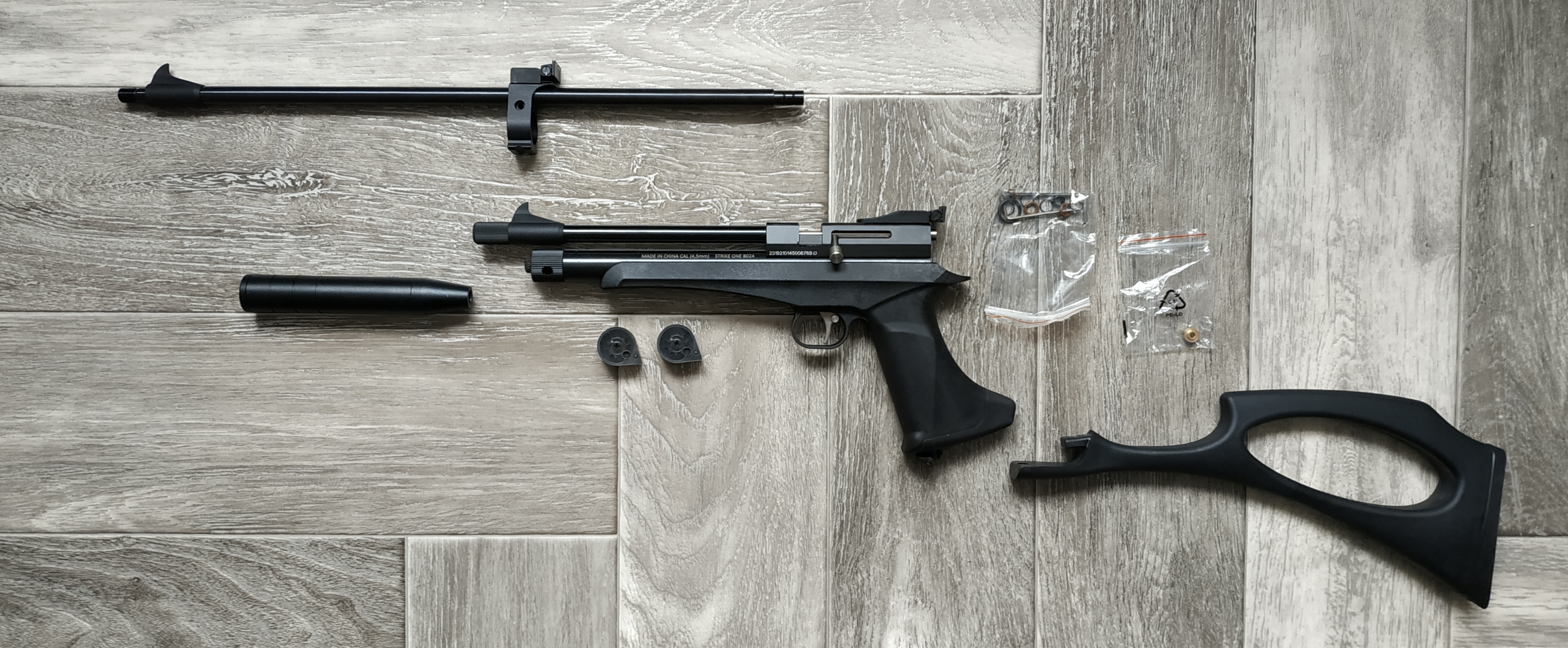 Отличная, очень интересная модель. И пистолет и карабин (съемный приклад), однозарядная или много зарядная стрельба (в комплекте два магазина на 9 пуль). Еще и два стволика в комплекте. Модератор, конических стаканов внутри как в моем рапторе)))). Очень прикладистая.