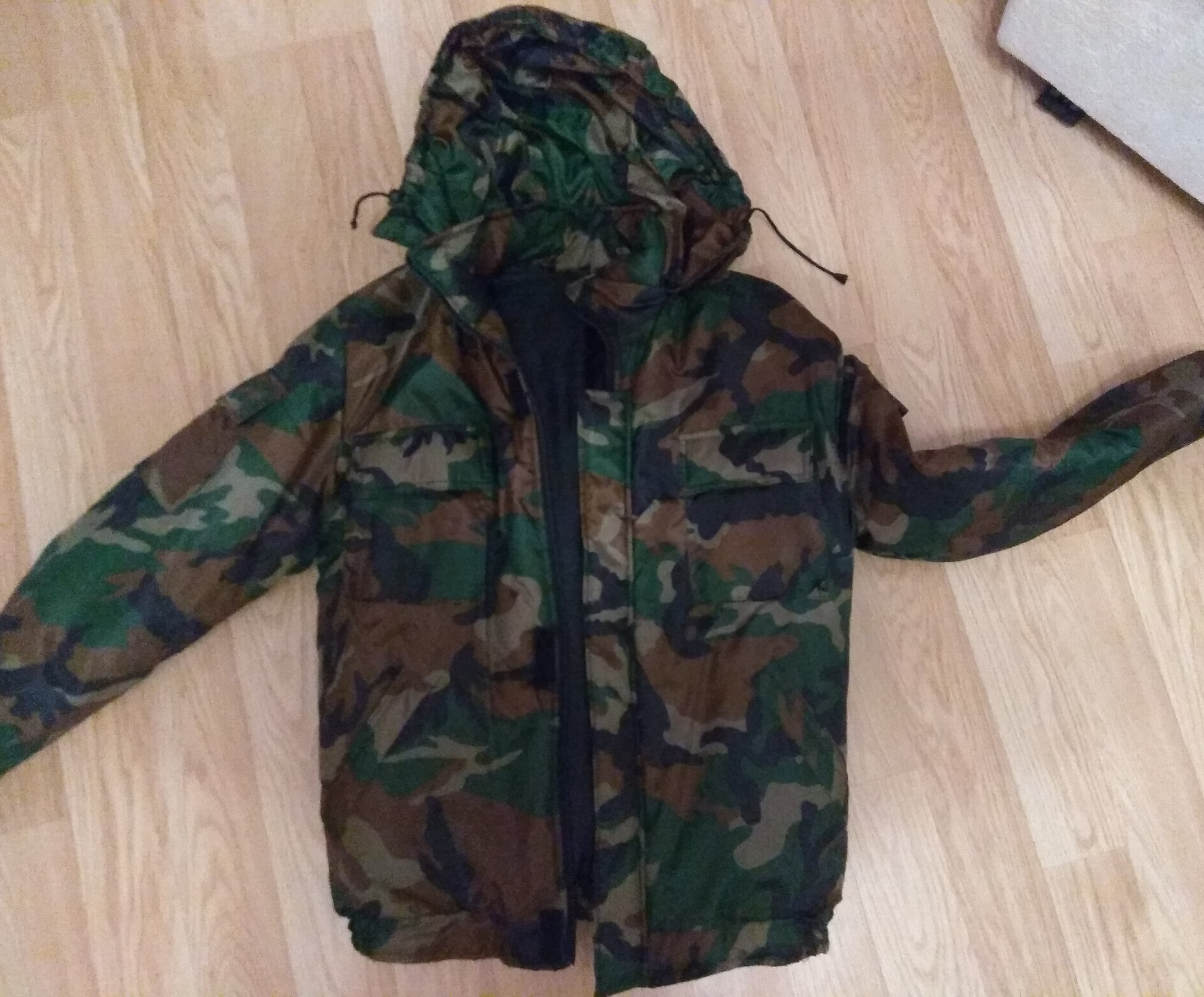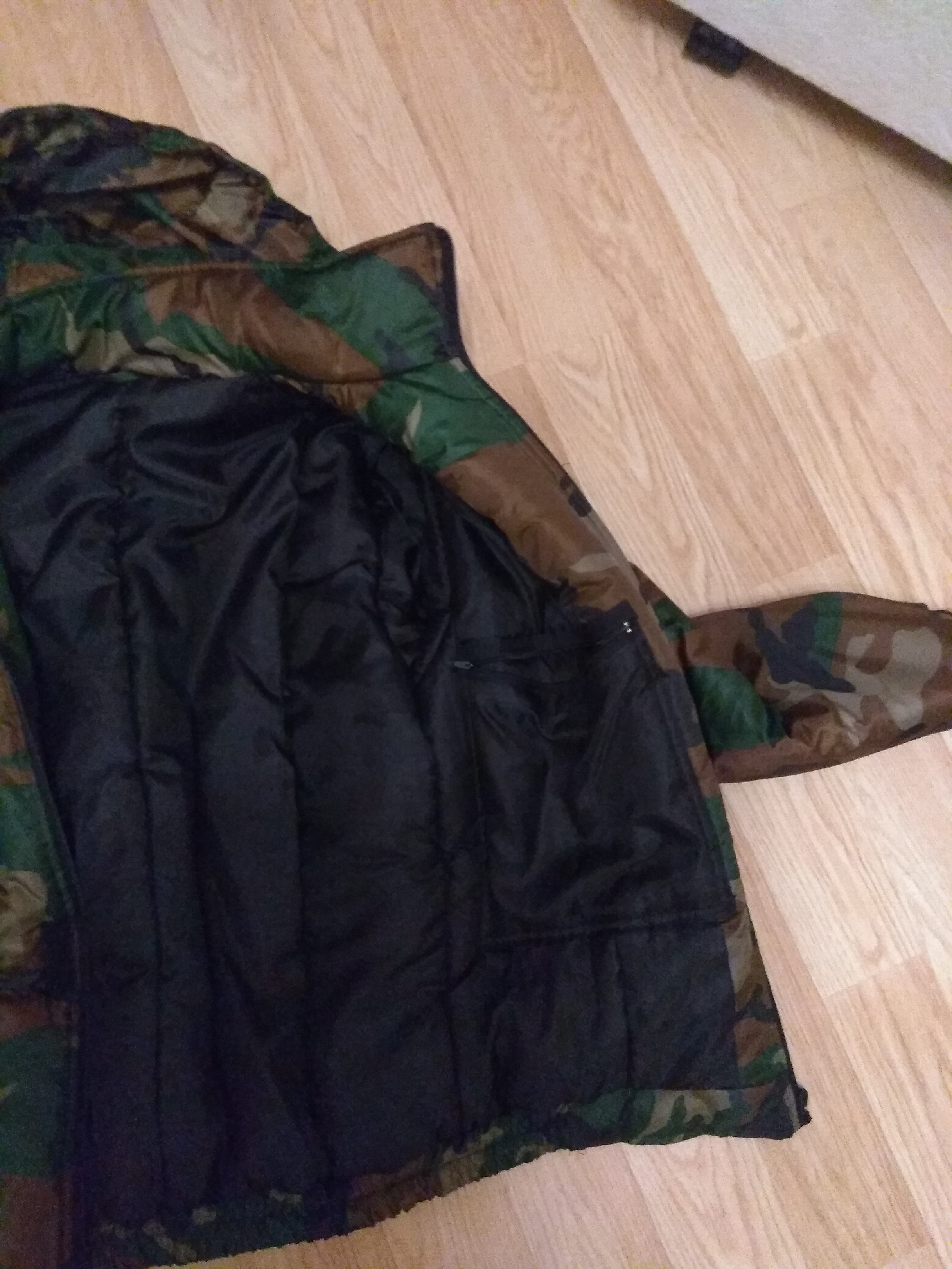 2. Костюм на синтепоне. Размер не знаю, шился на заказ. Но на мои 75кг. и 180см. впору. Ткань по типу легкого оксфорда. Легкий (чуть меньше 2кг. весь костюм), очень теплый (зимой сидел на месте около часа при -15 по цельсию - замерзли только руки без перчаток), малопромокаемый. Цена пусть будет 45руб.