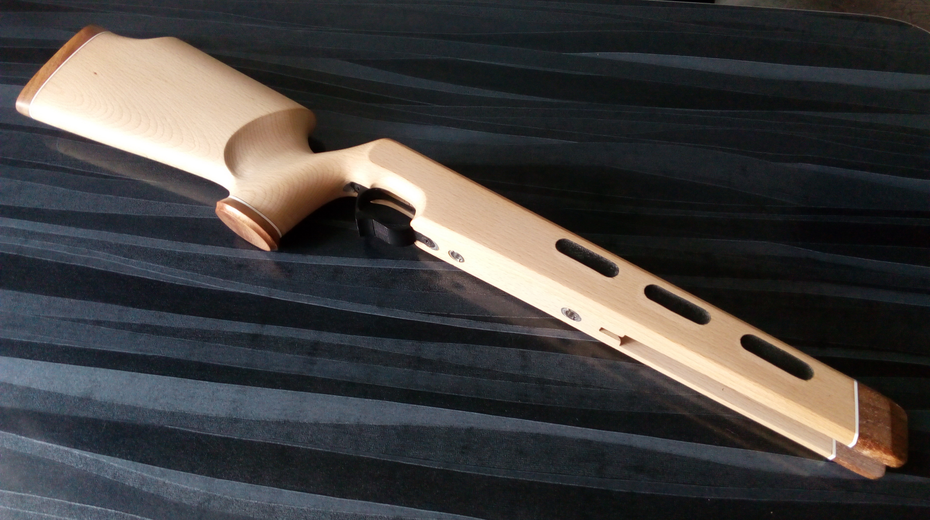 На фото носиков цевья видно как отлично сливается этот декор после зачистки с основной ложей. Позже так были подогнаны остальные элементы. Ну а на тот момент уже вот такой облик приняла буковая ложа с декоративными элементами из экзотической породы. Скоба пока не закреплена: