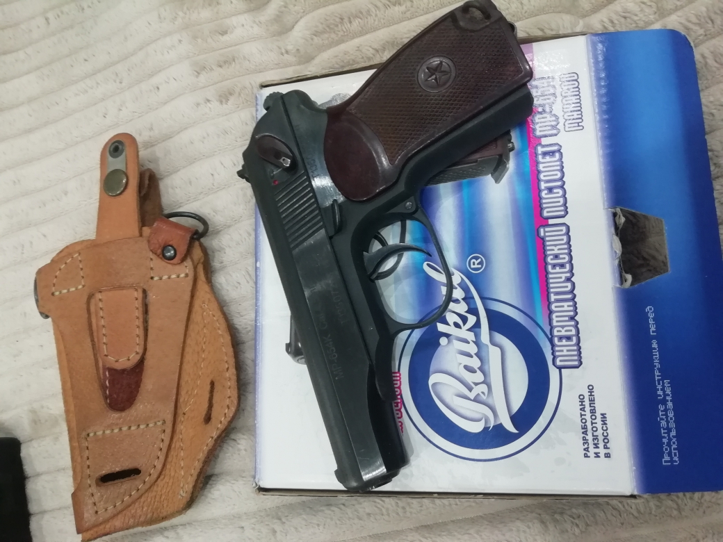 Продаётся Пневматический пистолет МР-654К "Макаров" б/у + в подарок: кобура с какими то примбабасами видно на плече вешать + около 300 пулек + 5 баллонов с газом "Quatro".