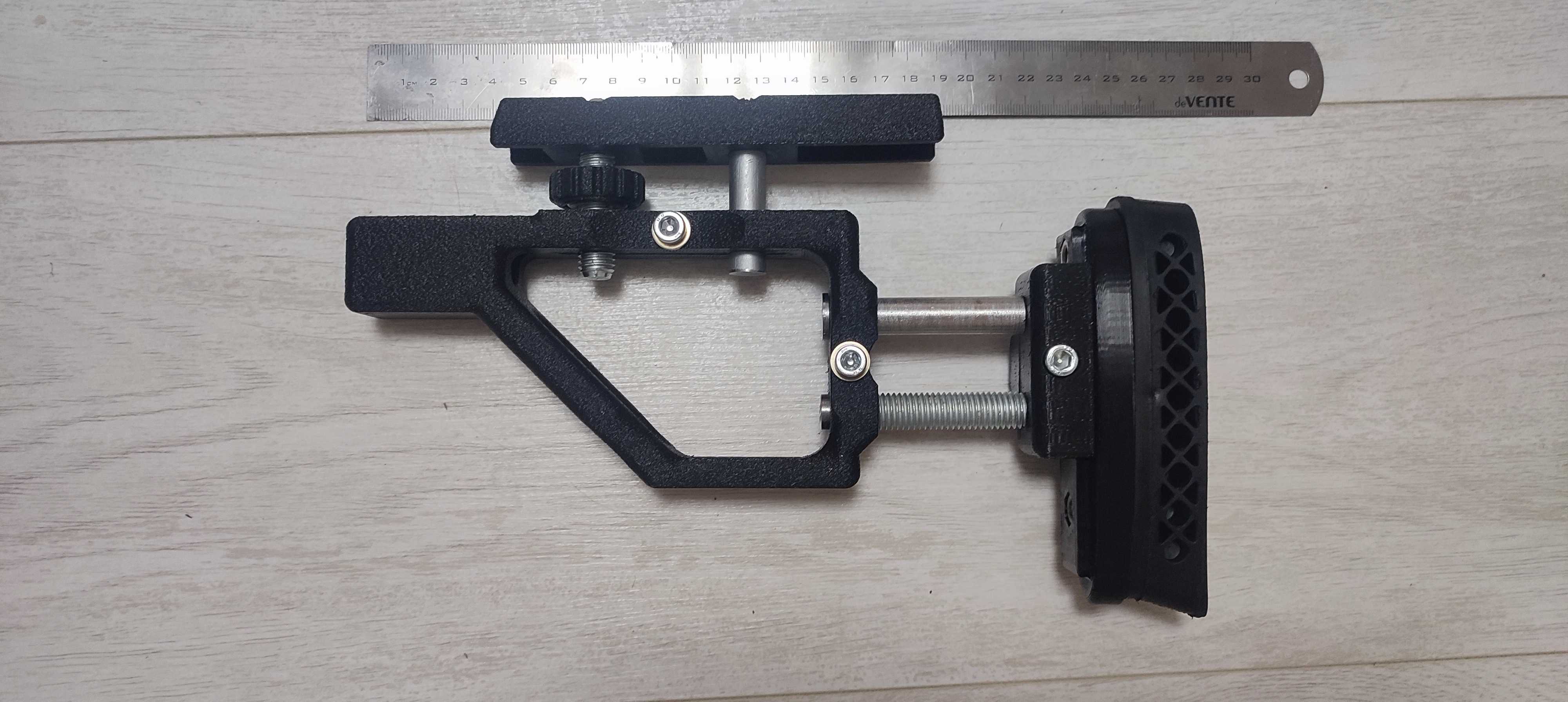 Продам приклад. Размеры на фото, регулировка по длине 4.5 см, по высоте около 3 см. Распечатан из petg пластика (детали подогнаны хорошо, люфтов нет), вес изделия около 630 гр. Переходник для крепления приклада по вашему чертежу распечатать не проблема, это будет входить в стоимость приклада