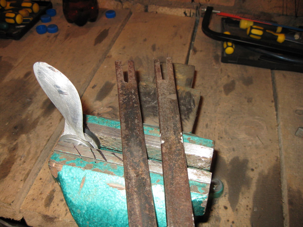 Поскольку применяется понижающий редуктор, то чем меньше оборотов на выходе, тем больше диаметр винта, а углы меньше. А коли так, то винты можно гнуть из плоской заготовки. Для этого применяю две разводки, сделанные из хорошего металла (мотоциклетные монтировки). Заготовку винта зажимаю в тиски через две толстые шайбы, в качестве которых использую две гайки от болгарки. Углы, на которые загибаю заготовку, отмечаю на губках тисков маркером. Остальное видно на фото: