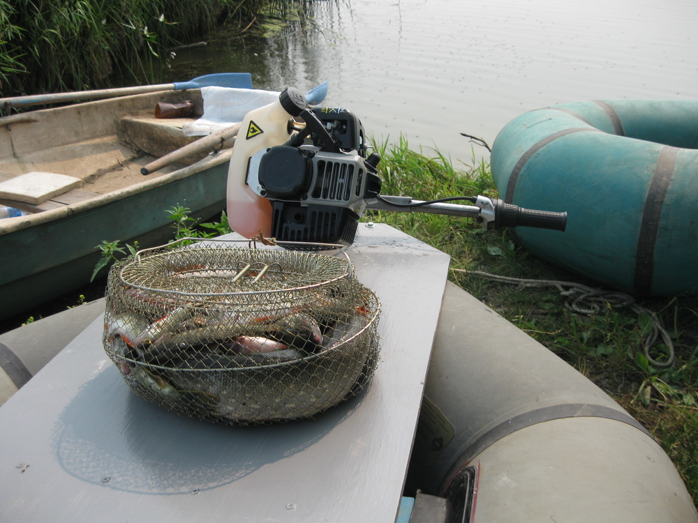 Сегодня первый раз поехал на рыбалку. Очень активно клюёт мелкий окунь. Практически везде. Поэтому дальних переходов не делал - километров 4, не более. Утром был штиль, но в полдень пришлось возвращаться против довольно сильного ветра. Плыл около получаса. Плыл и наслаждался: каково было бы махать вёслами под палящим солнцем. Шёл на средних оборотах, т.к. торопиться было некуда. С защитным кольцом курсовая устойчивость очень хорошая - румпель почти не держал. Обе руки свободные - можно сигаретку прикурить, водички попить. Завтра опять поеду. Попробую половить троллингом - всё равно полчаса туда и столько же обратно без дела сидеть скучно.