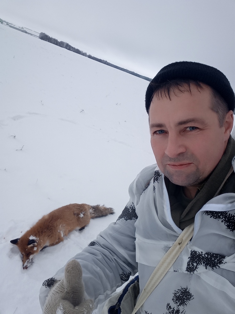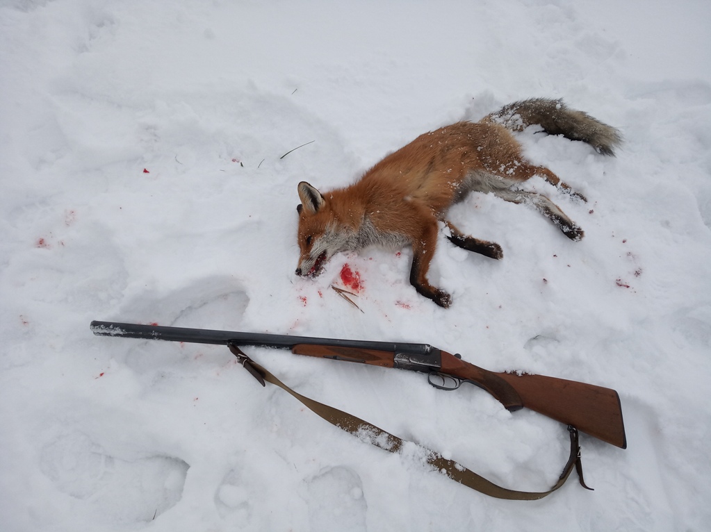 Не самый добычливый сезон, но всё же не пусто. 7-го января по возвращению домой решили с супругой потоптаться в зимнем лесу и на выезде из оного на поле присек мышкующую рыжую. Время около 15.00 Полюбовались ею в бинокль. Было принято решение через неделю взять её с подхода. Итак. 12 января. Времени у меня было не больше полутора часов. К 14.00 я на позиции с соблюдением всех правил маскировки. Ветер, повезло, на меня. Выдвигаюсь вдоль заснеженной канавы к окраине небольшой рощицы. С помощью оптического прибора, именуемого биноклем, сканирую белую целину поля. Никого. Но я ж не первый год замужем. Пройдя метров 300 присекаю движение. Расстояние около полу-километра. Две секунды и исключительно надёжный верный Юкон 8х40 идентифицирует источник движения как мою новую знакомую. Есть. Применяя весь накопленный опыт, начинаю скрадывать. Для меня охота на лису с подхода - один из самых сложных способов, но, наверное, самый увлекательный, любимый и честный. Тут кто кого. Двигаюсь за зверем, снег предательски похрустывает под ногами , но ветер на моей стороне и бобровые плотины, пропускающие воду с шумом, на руку. Но добыча удаляется от меня и, признаться, немного начинаю понимать, что всё может быть напрасным. Оглядев рукопись лисьих следов, делаю вывод, что лиса патрулирует своё поле вдоль и поперёк. Минув плотины, вижу в бинокль, что лиса намерена разворачиваться. Метров 200. Пора. Скатываюсь, как учили когда-то в военном училище, по склону канавы. Сливаюсь со снегом. Крик раненого зайки. Оп-па. Заинтересовало, но потом снова к своим делам. Выжидаю. Писк мыши. Снова пеленг. Ещё пару раз. Вижу, баражирует в мою сторону, но в стороне от канавы и параллельно ей. Уже не маню. Проверил стволы на отсутствие снега. С предохранителя снял заранее, ибо механизм с тройным запиранием бесшумно этого не позволяет сделать, как на том же 27-м. Веду её практически зарывшись в снег. 100-80-50. Слышу биение своего сердца и только. Метров 35-40 по диагонали. Всё. Огонь. ИЖ-54, снаряжённый 00, упакованными в самокрут, не оставляет зверю никаких шансов. Лиса добыта быстро и без мучений, что для меня очень важно. При осмотре определилось, что супостат оказался молодым лисом с шикарной шубой. Это второй за зиму. Первого сложно было назвать трофеем. Гандон жёванный. Этот - другое дело. На всё про всё ушло около 40 минут.