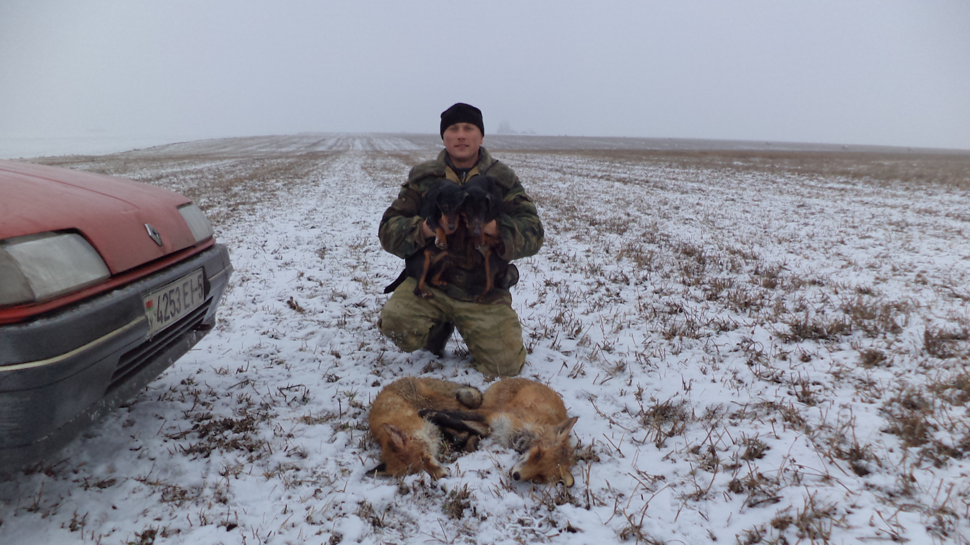 Вот маленький отчёт.На подходе к карьеру с норами ,замечаю много лисьего следа .Карьер большой ,попутно решаем топтануть серого,идём с братам по краям ,а собаки по серединине.На подходе к норам собаки заметусились(ну вот думаю и пришли).Но собаки обнюхав все входы ,норится не хотят и идут к траве.Цепляют свежий след лисы и уходят за метров 600.(Лиса облазив всё, легла в траве и услышав нас ,ушла неподпустив близко.)кое как отзываю собак и идём в следующий карьер(в прошлом году там взял в плен лису,а в этом году ещё небыл)Пришли ,три норы без признаков жизни,а вот последние два входа наоборот.Запускаю молодого и меньше чем через 20 секунд с другого входа вылетает КУМА ,Отпускаю на метров 25 и бью,падает замертво.Я уже и забыл когда такой быстрый выгон с норы был.Лиска молодая и маленькая.Дойдя до машины и перекусив, слышим два выстрела,они раздались из перелеска километра 3 от нас.Через минут 10 собравшись ехать дальше замечаем идущую лису в метрах 100 от нас.Стоим возле кустов ны выгоне и она идёт по выгону в сторону озимых.Заводим машину догоняем ,один выстрел начинает вилять и снижать скорость,быстро выпускаю собак и они мчат за ней.Лис увидев собак выравнивается и несётся как не в чём не бывало, выбежав на жито ёщё пробегает метров 300 и садится занимая оборону.Первая подлетает сучка хватка пасть в пасть и молодой приходит на помощь.Лис крепкий (но львиный хвост)зубы очень большие.(при хватке прокусил суке язык)