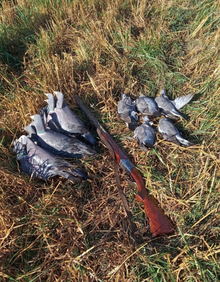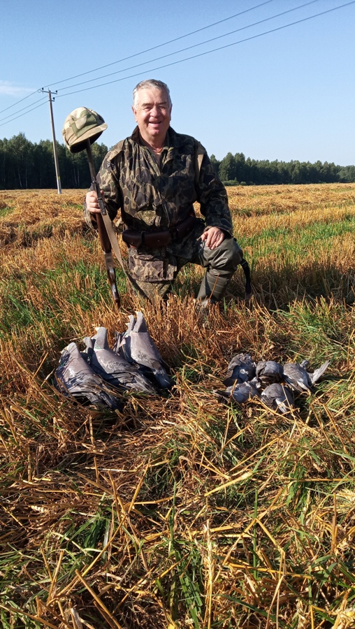 Шось у нас не густо с отчетами, точнее вашпэ никак. Помолясь начну, пожалуй. Хотелось бы повествовать про открытие, но фотоотчётом его подкрепить не получится. Поскольку в угодьях, где я принял решение охотиться в этом сезоне, утки совсем след простыл в отсутствии какой-либо воды, решено было открываться по вяхирю. Рапсовое поле подарило 11 птиц. Через неделю решил охотиться на убранном зерне, но непременно там, где скошенную растительность не собрали ещё в тюки. Пригласил в компанию старого уважаемого охотника, который, к слову, только сейчас открыл для себя охоту на вяхиря, чему был несказанно рад и премного благодарен за представленную возможность поохотиться в отсутствии кряковой. Его, собственно, и поместил я на фото, прикреплённое к отчёту. Итак. Суббота. Исходя из какого-никакого, но всё-таки уже имеющегося опыта подобных охот, выезд на поле брани был запланирован на 05.20. Прибыли, расставили 18 чучел, в т.ч. 1 на удилище перескопом на восток. Скрадком служила имеющаяся в изобилии солома. На обоих охотниках «лешие». Всё случилось как раз вовремя. Я предоставил возможность вести огонь своему коллеге, сам только вёл наблюдение за процессом. Решили в качестве эксперимента, что стрелять он будет только по той птице, которая садилась к чучелам (к слову стрельба велась уже по взлетающей птице). В итоге таковых набралось около десятка, 5 из которых были успешно старичком добыты. Сказывался возраст охотника, да и волнение при приближающемся налёте никто не отменял. Тем не менее удовольствие от процесса было получено огромное. Пользуясь случаем, поздравляю всех открывшихся охотников с полем.