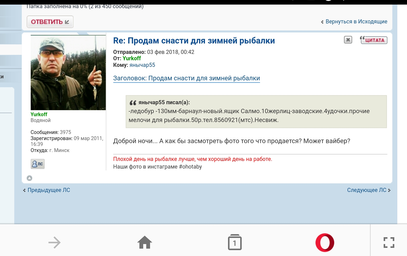 Ещё позавчера написал вам в личку,так и не дождался ответа. Жду от вас ответа на поставленный там вопрос.dansk писал(а):янычар55 писал(а):-ледобур -130мм-барнаул-новый.ящик Салмо.10жерлиц-заводские.4удочки.прочие мелочи для рыбалки.50р.тел.8560921(мтс).Несвиж.
