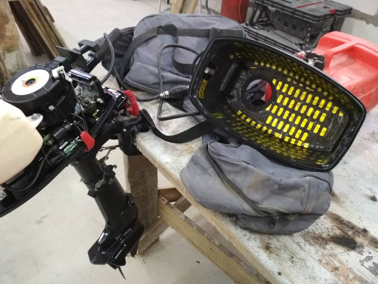 Топливный бак: внешний-12л, внутренний-2,5 л. Винт аллюминевый. Двухтактный. Мощность 3,7 квт или 5 лс. Рабочий объем 102 куб.см. Передаточное число 2,15:1. Переключение передач F-N-R. Вид топлива АИ-92. Преимущества: небольшой вес и простота переноса мотора, небольшой расход топлива, прост как АК-47. Заводится с полоборота.