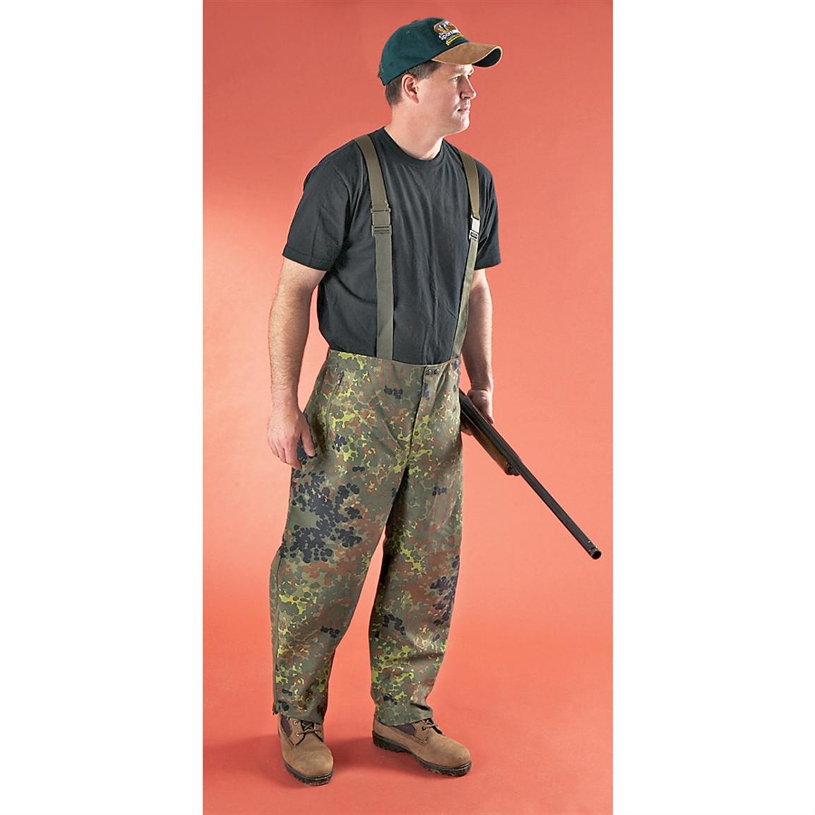 Брюки (по крою - полукомбез) оснащены подтяжками (с регулировкой высоты/длины) и высокой поясницей, имеют два фальшкармана на молнии для доступа к внутренней одежде, объем талии регулируется липучками, низ брючины "расклешается" молнией для возможности одевания поверх массивной высокой обуви (сапог).