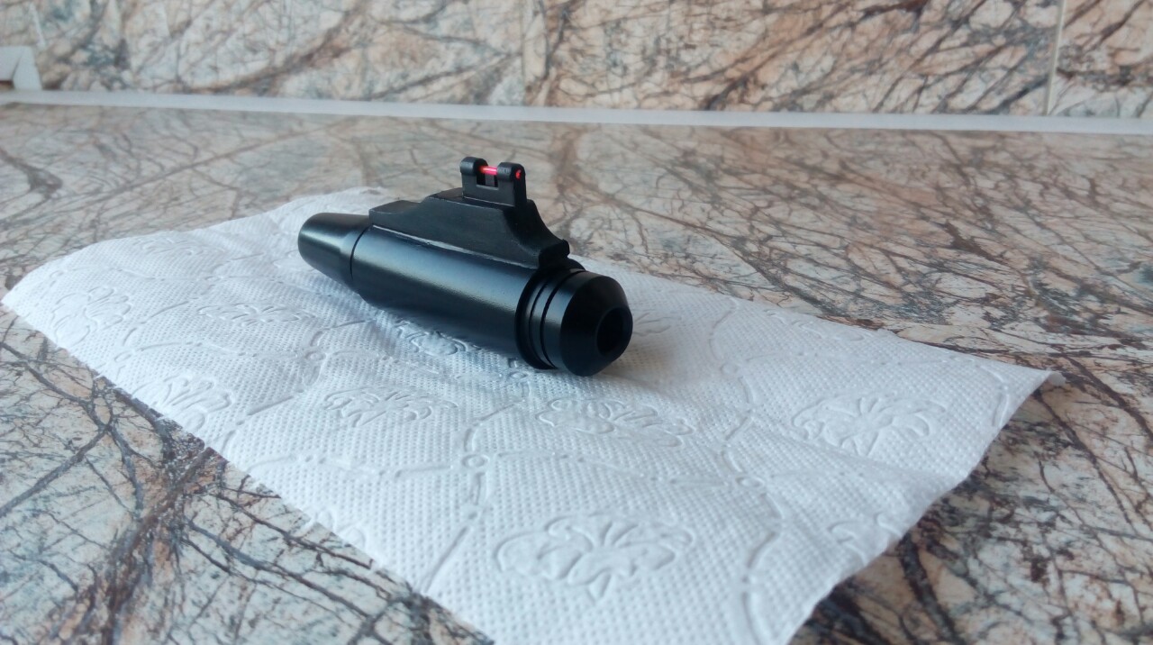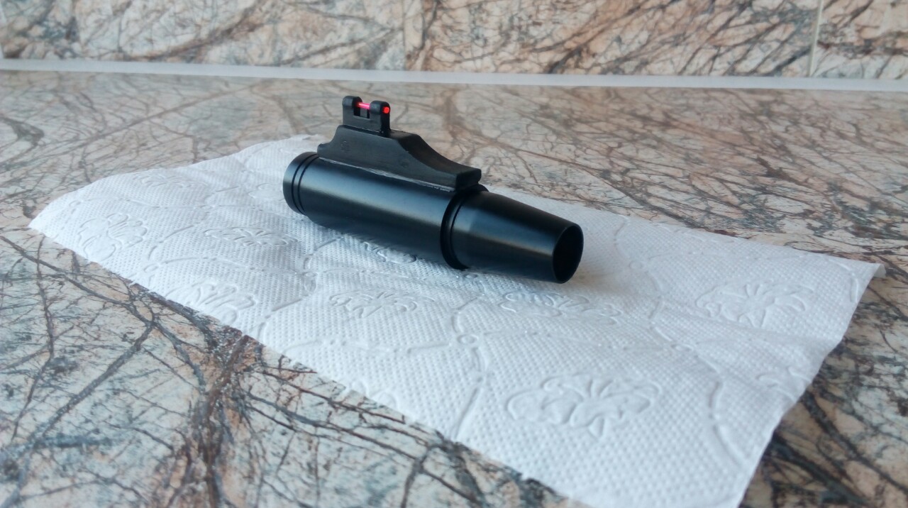 Ну приспособиться конечно можно. Уверен если попрошу дружище Руслана (Felix) смоделить и выполнить на 3d принтере красивую мушку-сделано было бы всё на высоте! Парняга с головой мыслящей и руками золотыми. Но пока это запасной вариант. Тут вот что..... Сваял я вчера на одну винтовку надульник с мушкой. Надульник стальной,навинчивается на ствол,заворонён и потом покрыт ружейным лаком "Нигрозин". На нём сфрезерована сверху плоскость,на ней установлена на 2 винта М3+ЭДП мушка от турецкой винтовки. Высота мушки идентична высоте родной мушке "Мурки"-от центра ствола до центра фибронитки ровно 29мм. Для надёжности снизу надульник с мушкой фиксируется гужоном М3. Т.е. исключено откручивание или мелкий люфт его на стволе к примеру при взводе винтовки(переламывании и обратно)-на стволе под гужоном сделана лунка и гужон отлично фиксируется таким образом.
