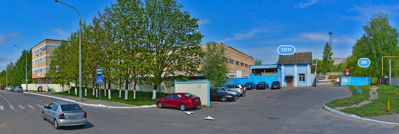 На фото слева здание конторы, справа ворота для въезда за товаром.