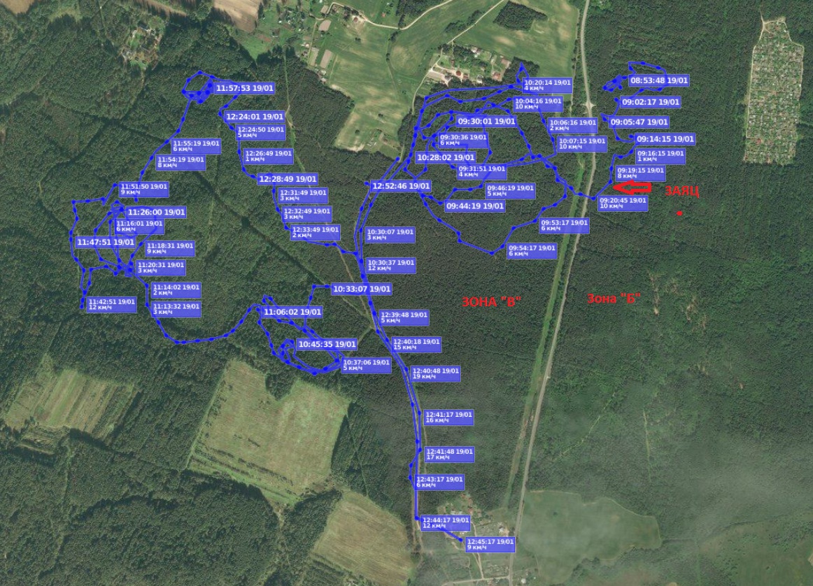 Праз некалькi хвiлiн выжлец зароў быццам ускочыу ў кiпень. Бачнасць у лесе з-за сьнегу i ламачча метраў 30. Заяц робiць круг па лесе, па навiгатары прайшоў у 60 метрах ад мяне. Спадзяюся, што дасць другi па сваiх слядох. Пачынаю цiшком падыходзiць. Але другога круга не было. Заяц выскачыў з лесу i пабег на дарогу, а пасля у бок хутароў.