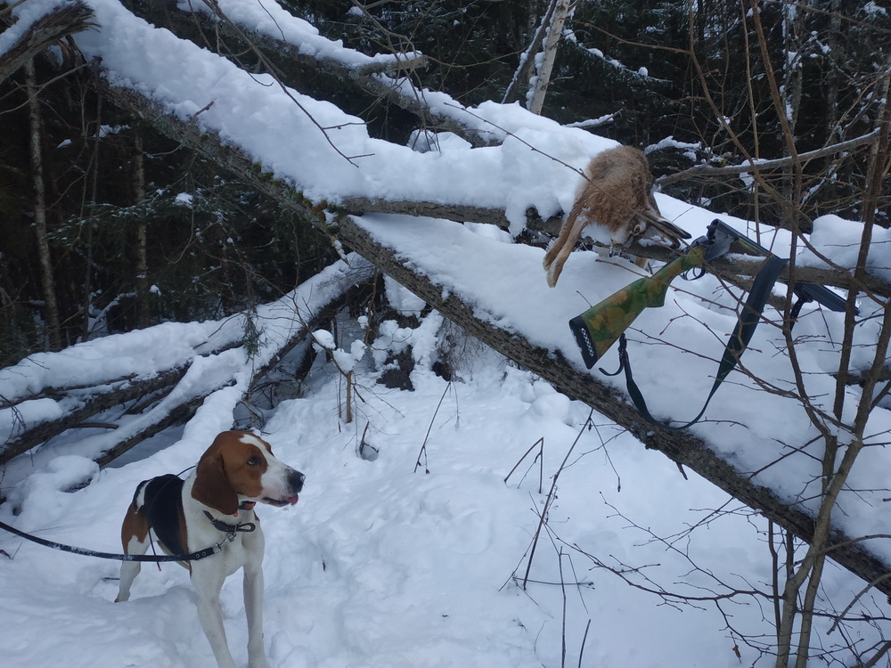 Следы на снегу описали ситуацию: какой-то голодный человек подстроился под гон, добыл зайчика и быстро исчез. Тропление охотника к успеху не привело - очень он спешил :-)