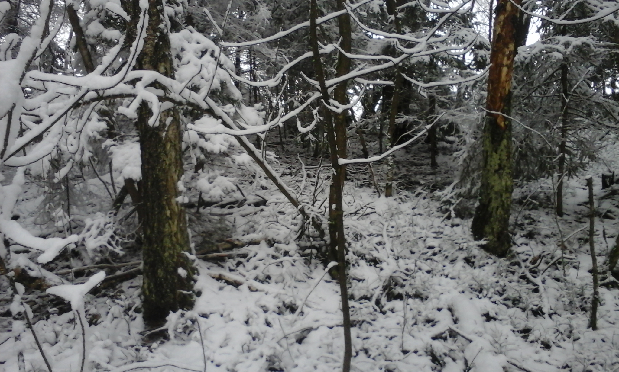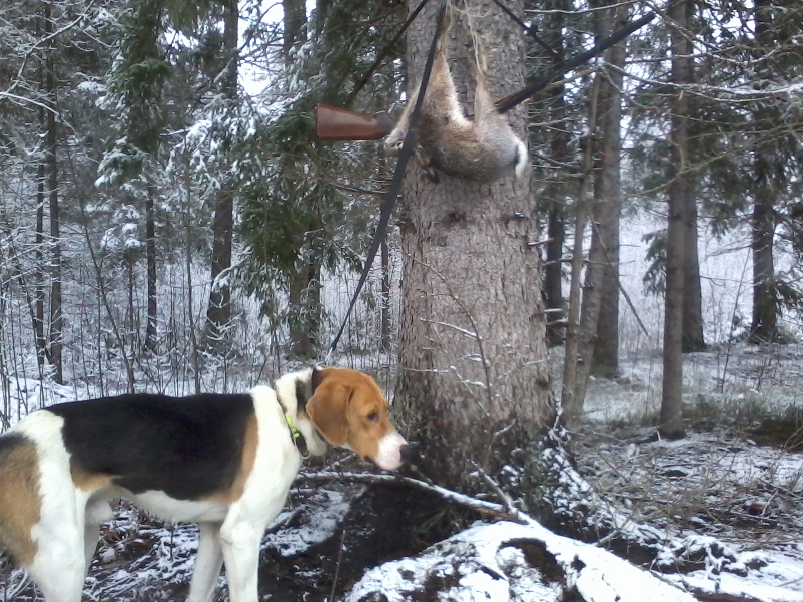 Пока я доплёлся до массива, гончие товарищей где-то отыскали зайца и час по нему отработали. Навесь на деревьях сильно гасит звуки гона. ЭГ практически не было слышно. Если неделю назад став на вершине холма то здесь, то там гон можно было слушать с утра до вечера, то в этот день – белое безмолвие. Прибыл как раз вовремя. Заяц праздновал победу. Поставил выжлеца на след и стал слушать его соло. Решил брать пример с Мiкалая не сходить с места пока не добуду зайца)) Возник спор с товарищами по поводу видовой принадлежности косого, ввиду его страсти к ельникам и даже отсутствия попытки выхода в поле. Я упорно отстаивал русака, но чтобы не лишать себя надежды его добыть и не подшуметь, согласился на тумака))