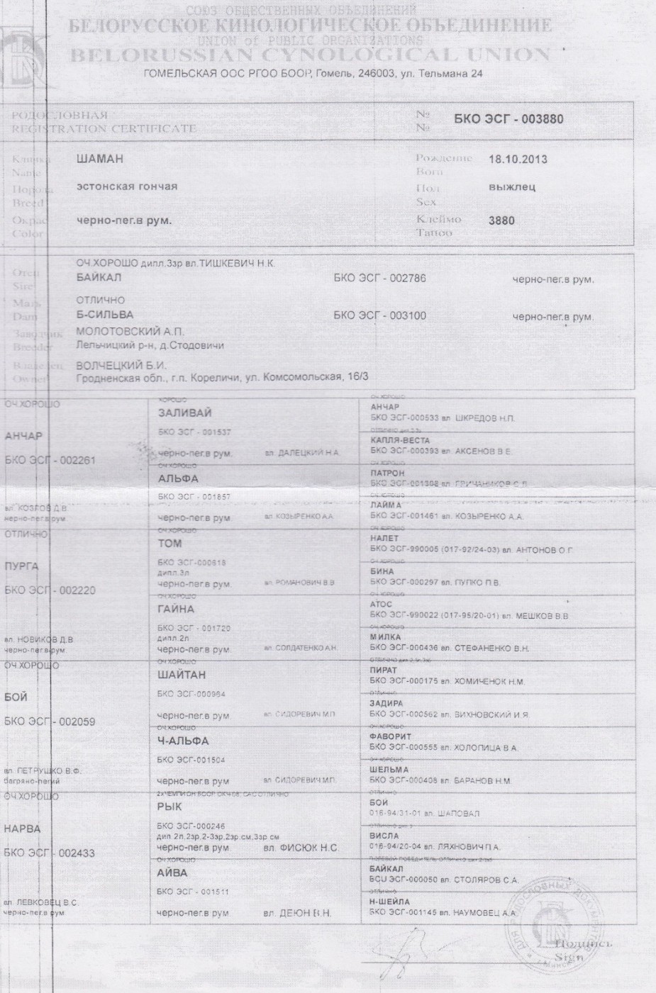 11. БКО ЭСГ-003880 ; 18/10/2013, Шаман, вл. Волчецкий Б.И.