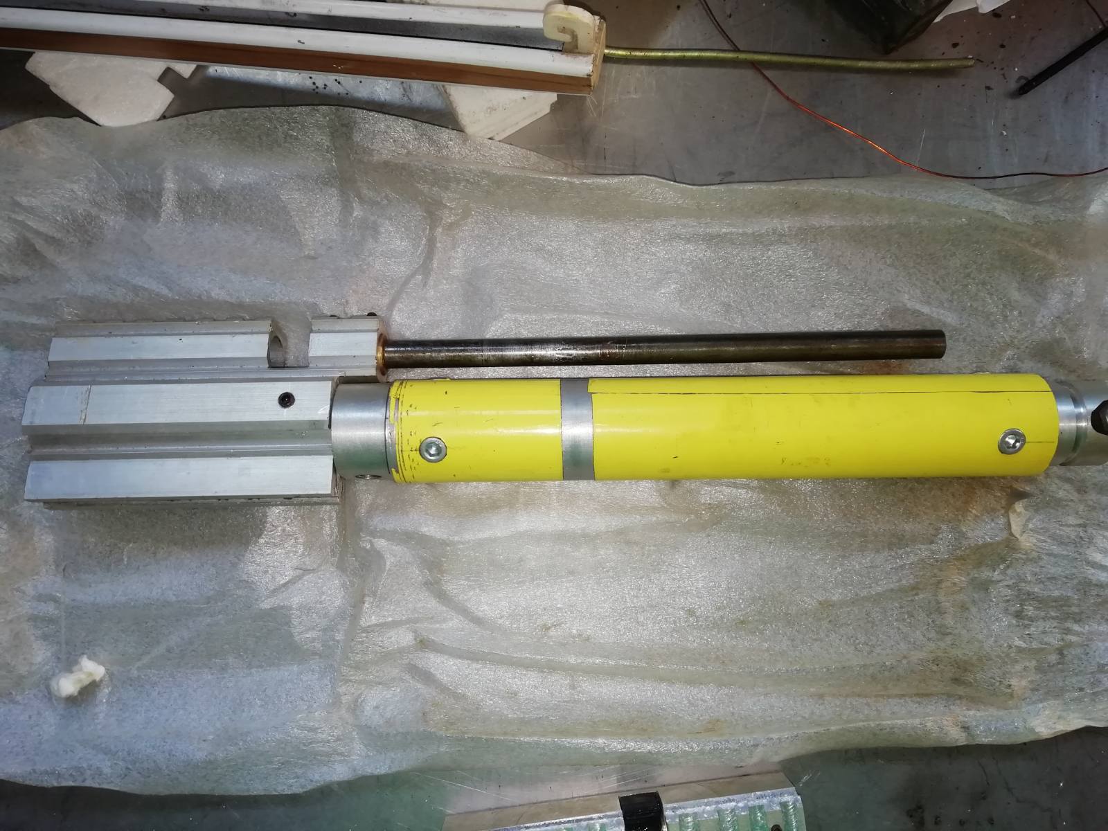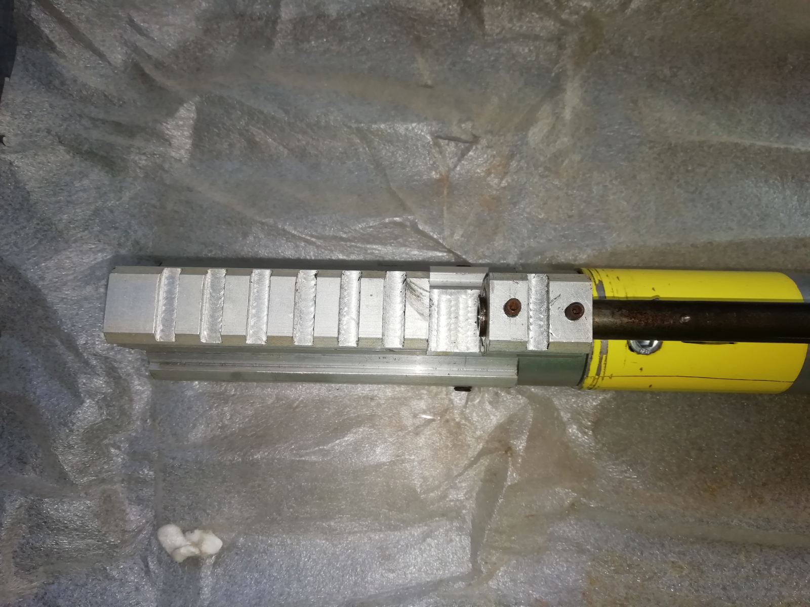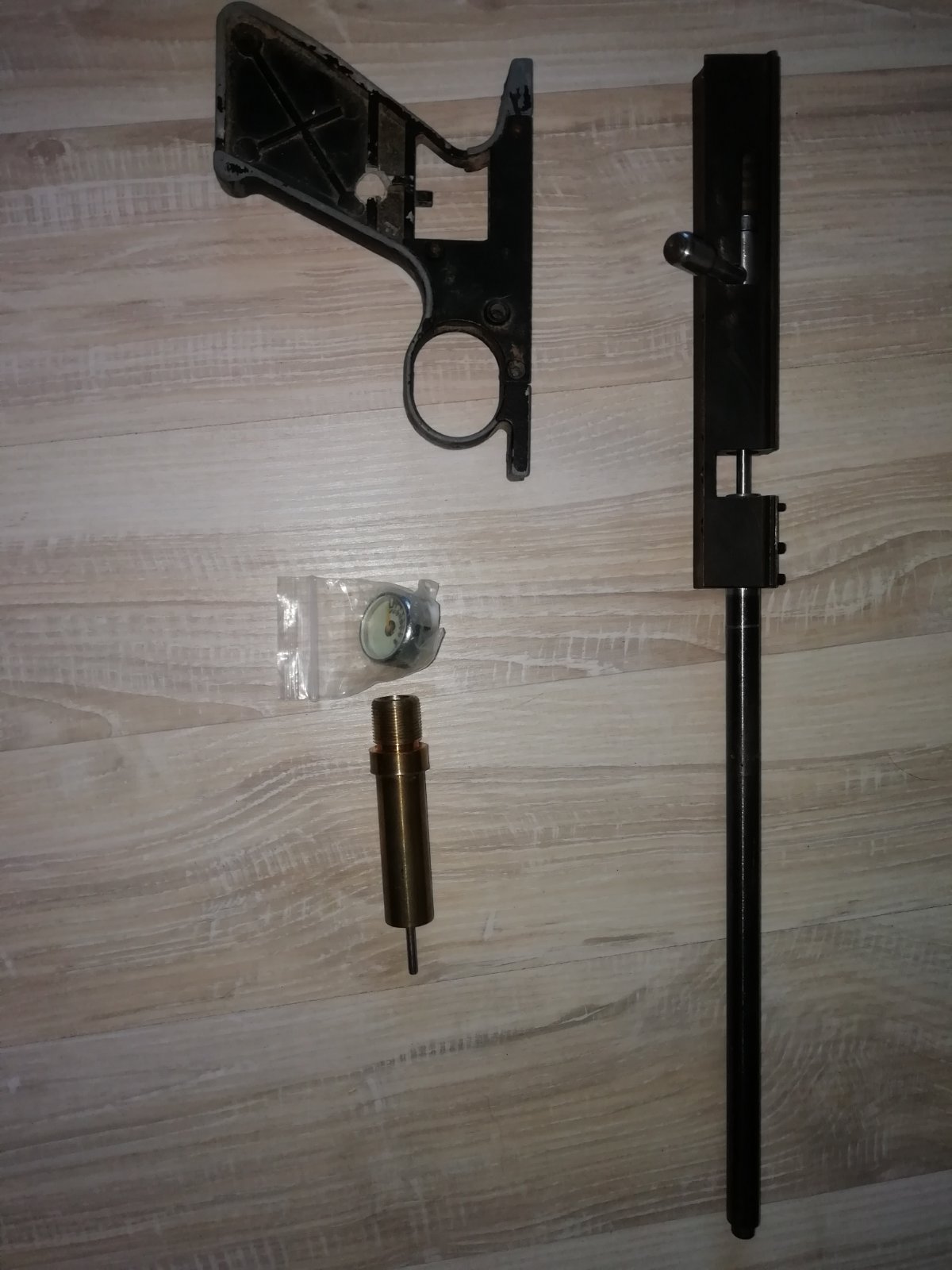 Недопиленный резик, труба крюгера ф30, пробки местные глухие, нужно точить под манометр и клаппаную группу она тоже есть на фото, манометр в комплекте, к резинку редуктор от лешего, в ходит в трубу отлично, но нужно точить в задней пробке ответную резьбу. Крысоручка пустая без шептал и пружин