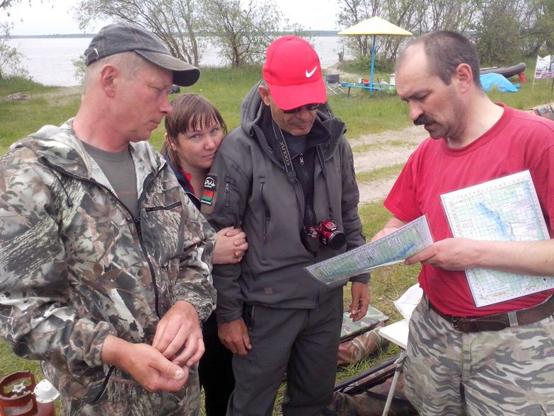 ответственный за проведение 1-го этапа объясняет местным аборигенам особенности водоема: