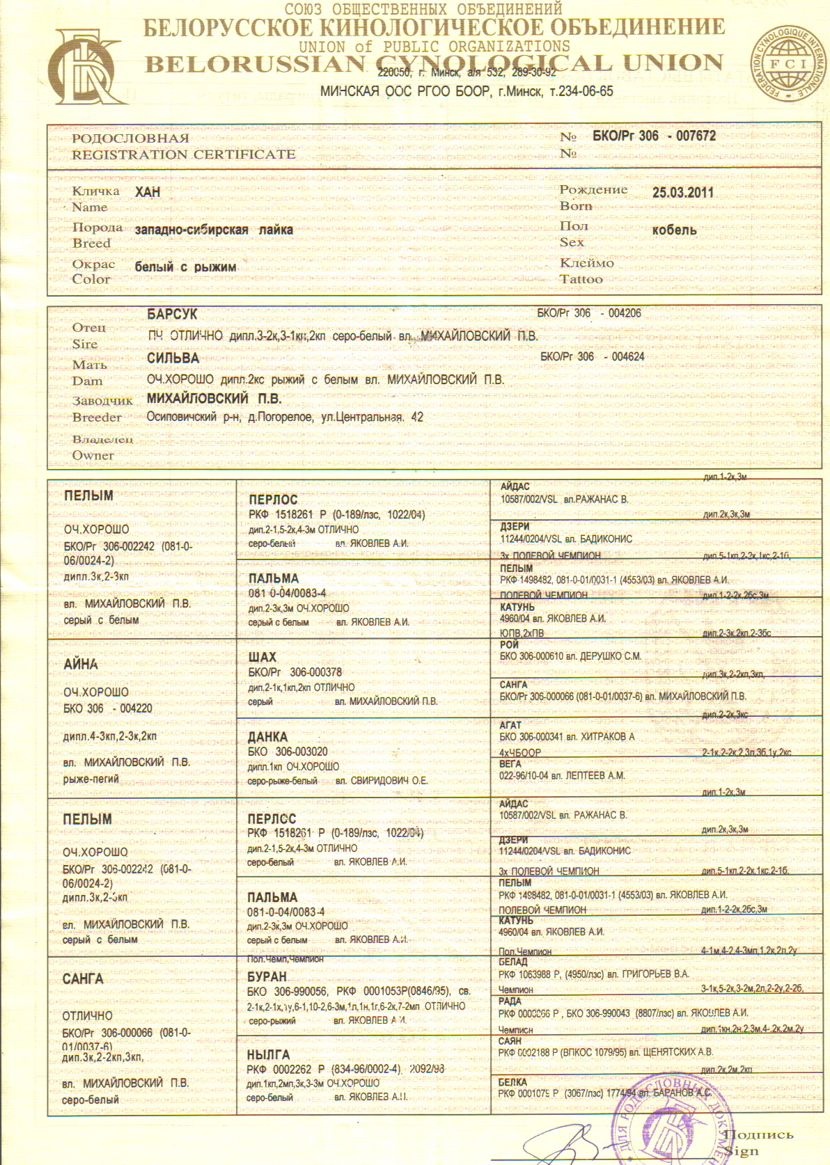 2.1.1 Кличка, номер родословной, фотография родословной с двух сторон.