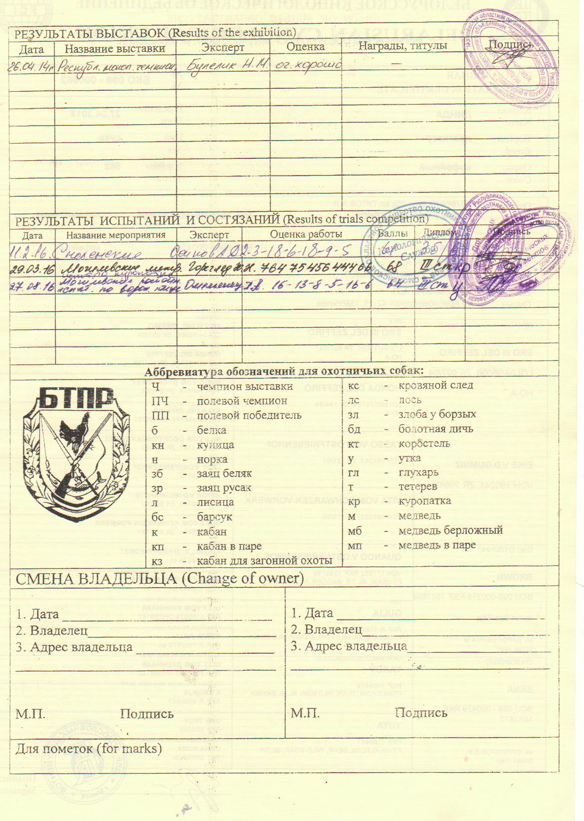 Мать : дипломы 3 куропатка, 3 болотная дичь, 3 утка, 3 вольерный барсук.